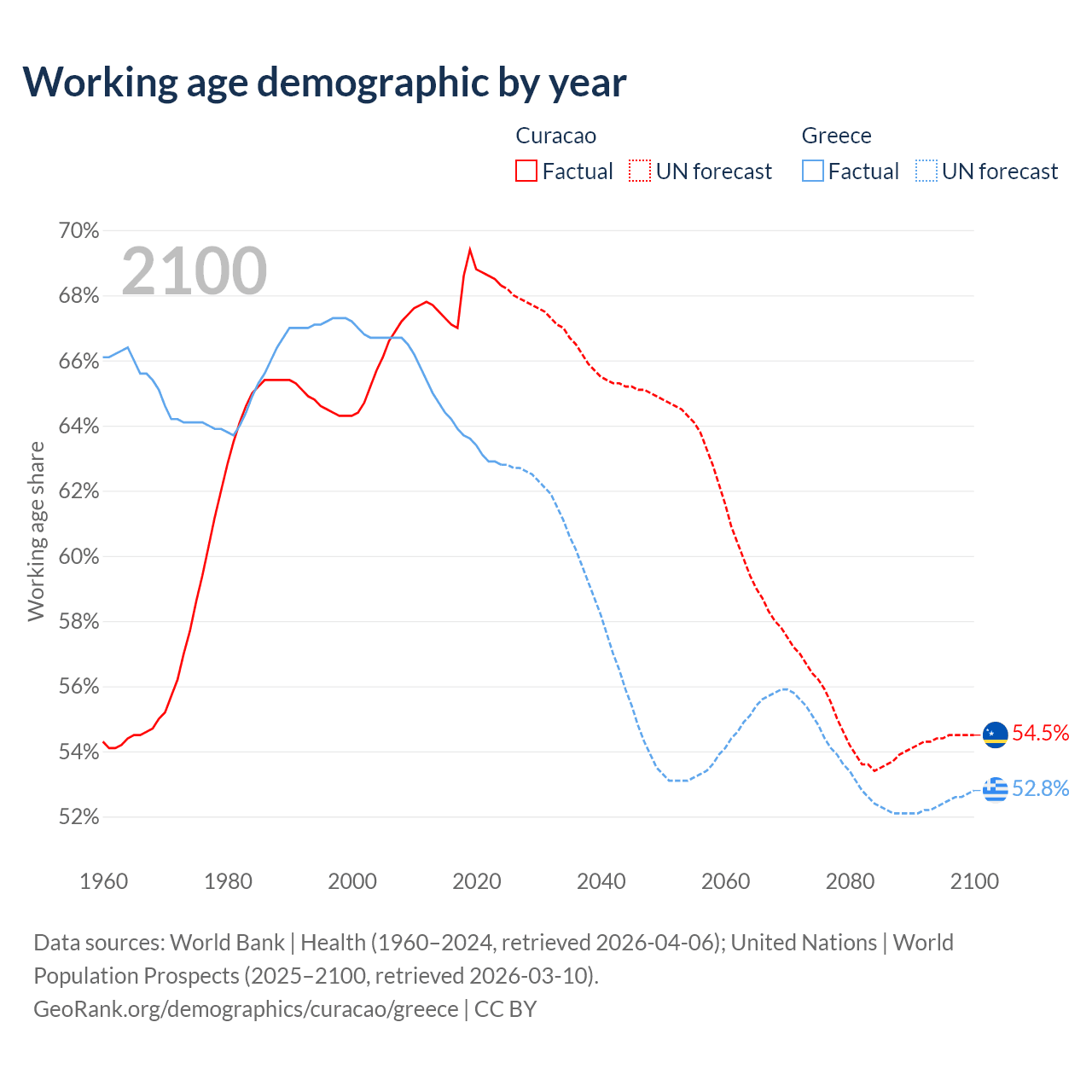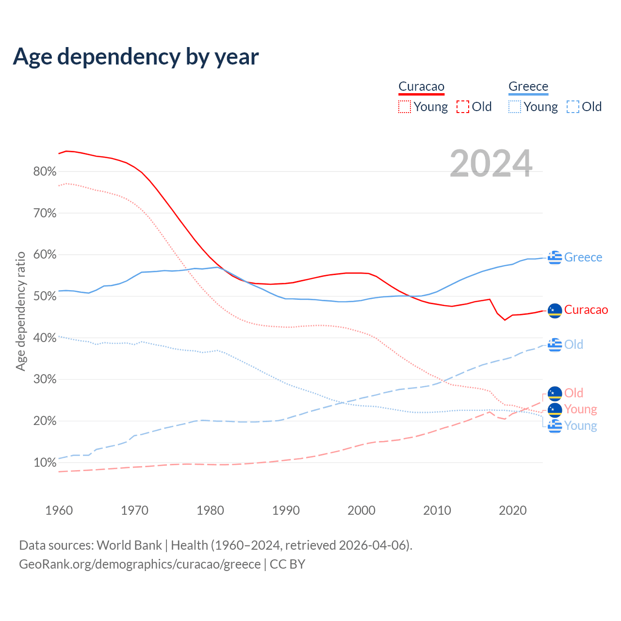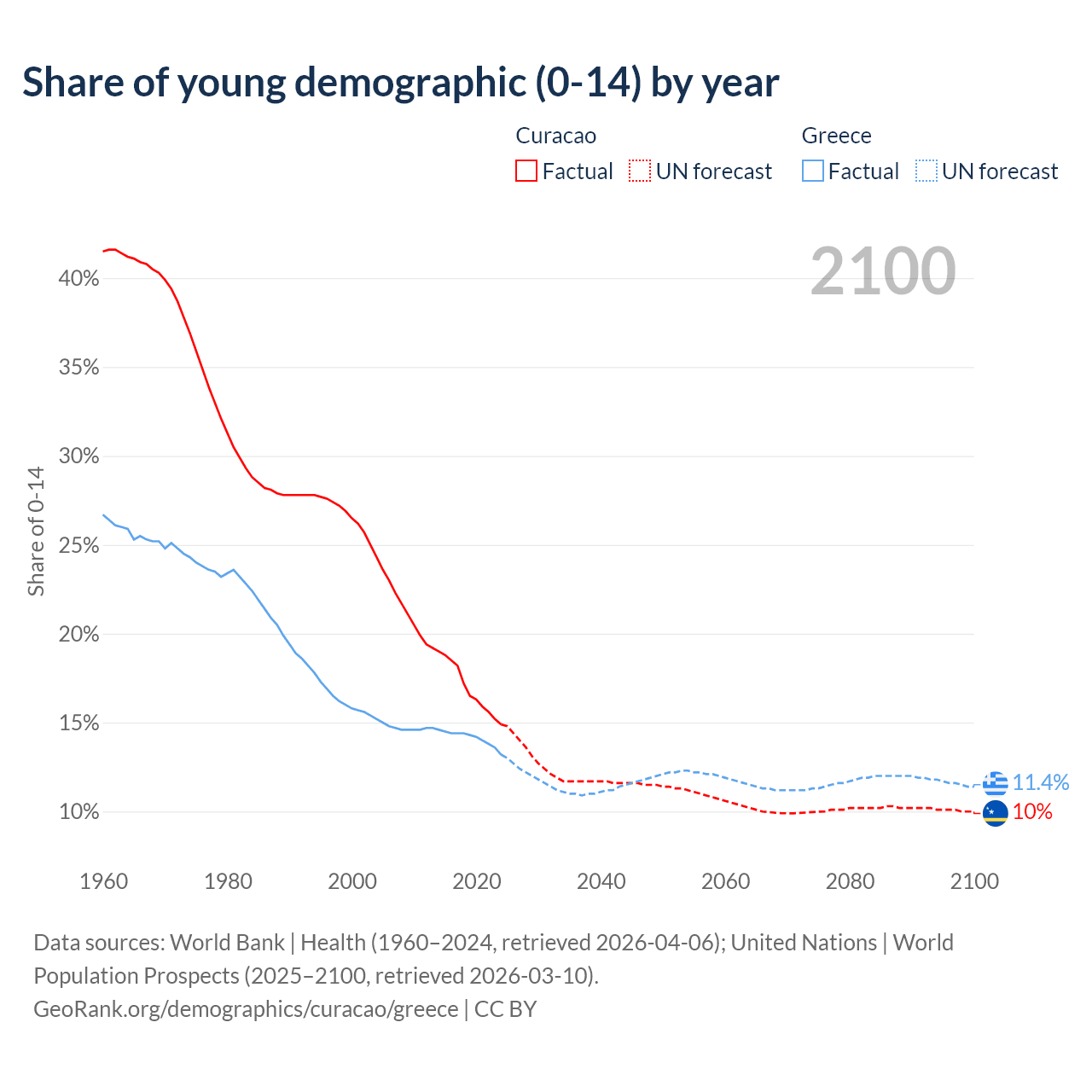 - The share of young demographic (0-15 years old) in Curacao is 14.9% vs 13.2% in Greece.
