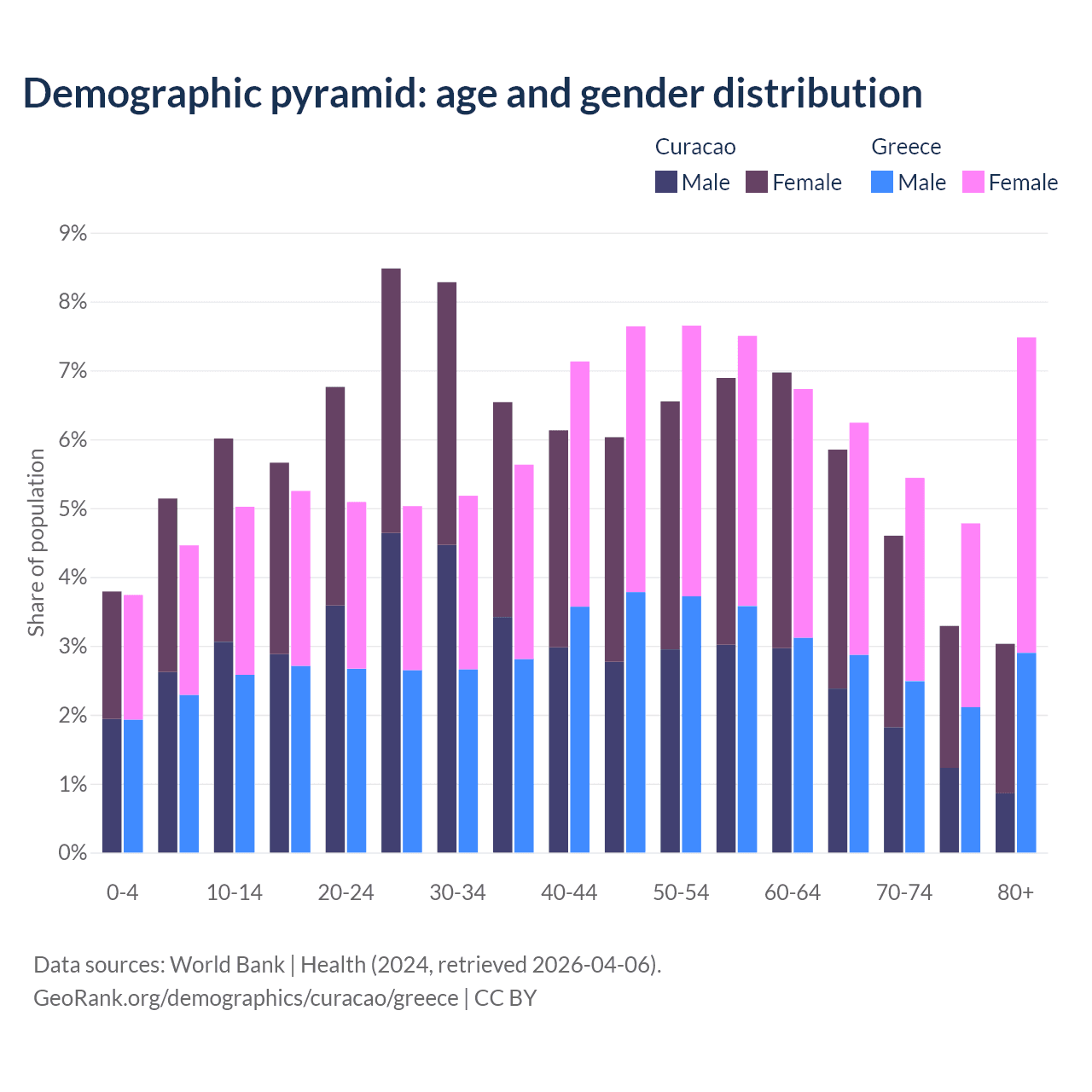 - The share of old-age demographic (65+) in Curacao is 16.8% vs 23.9% in Greece.