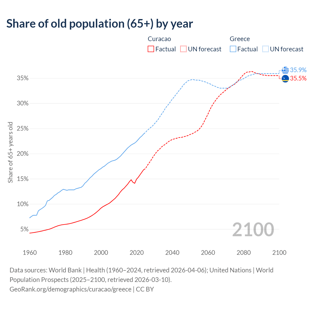 The share of older people aged 65 and over is 16.8% in Curacao and 23.9% in Greece. Life expectancy in Curacao compared to Greece .