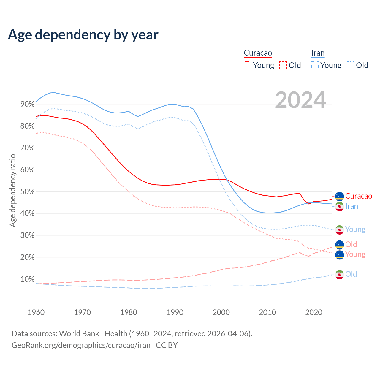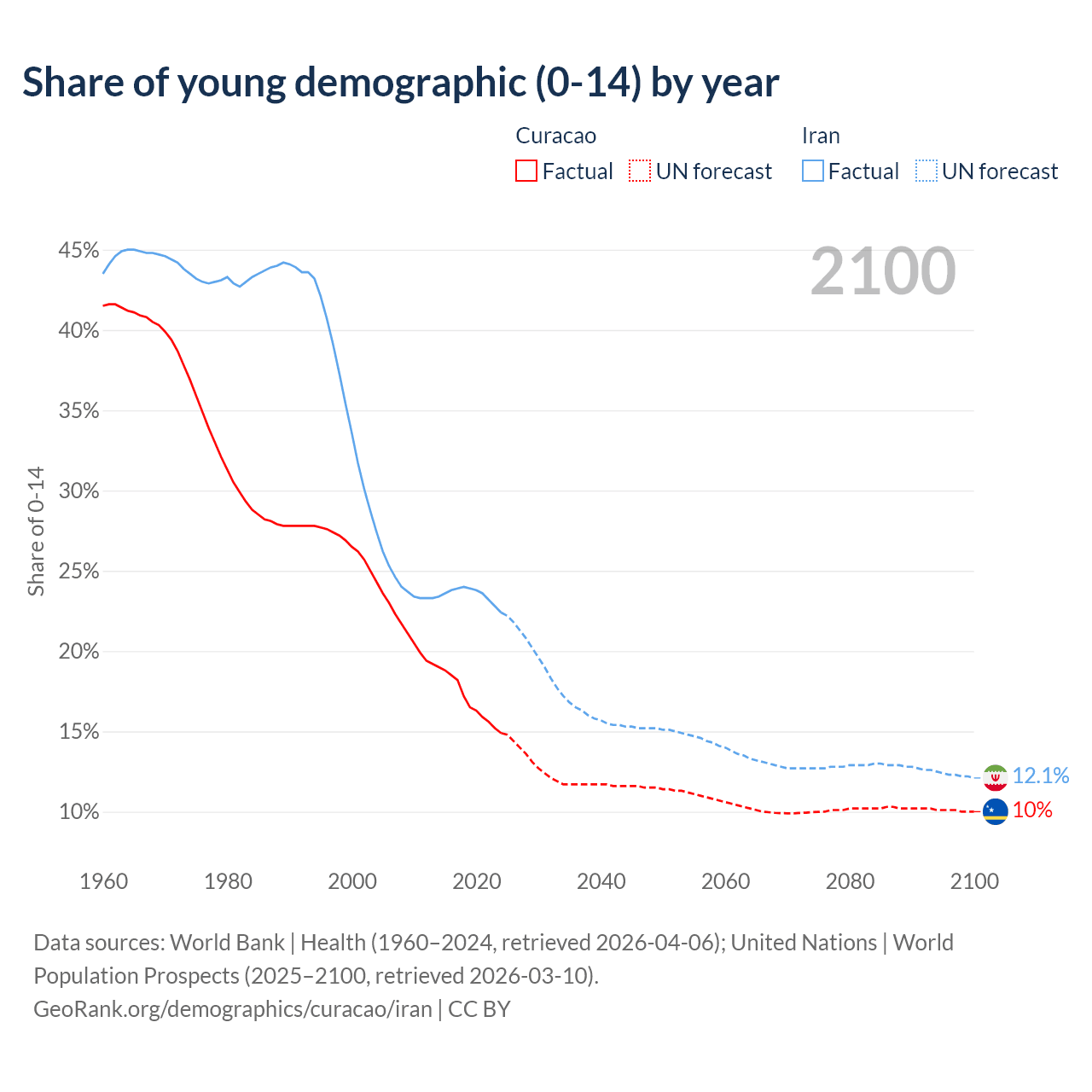 - The share of young demographic (0-15 years old) in Curacao is 14.9% vs 22.4% in Iran.