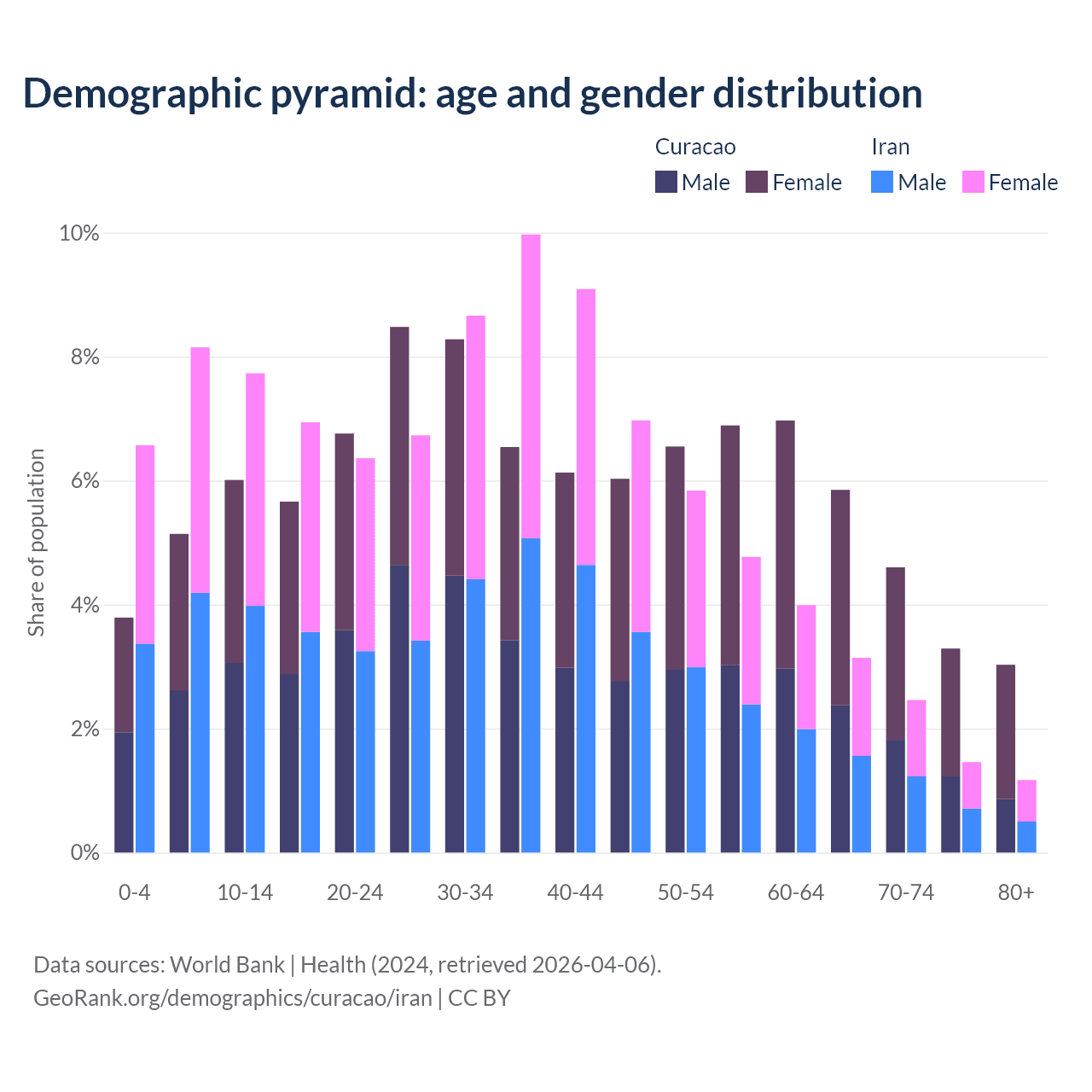 - The share of old-age demographic (65+) in Curacao is 16.8% vs 8.24% in Iran.