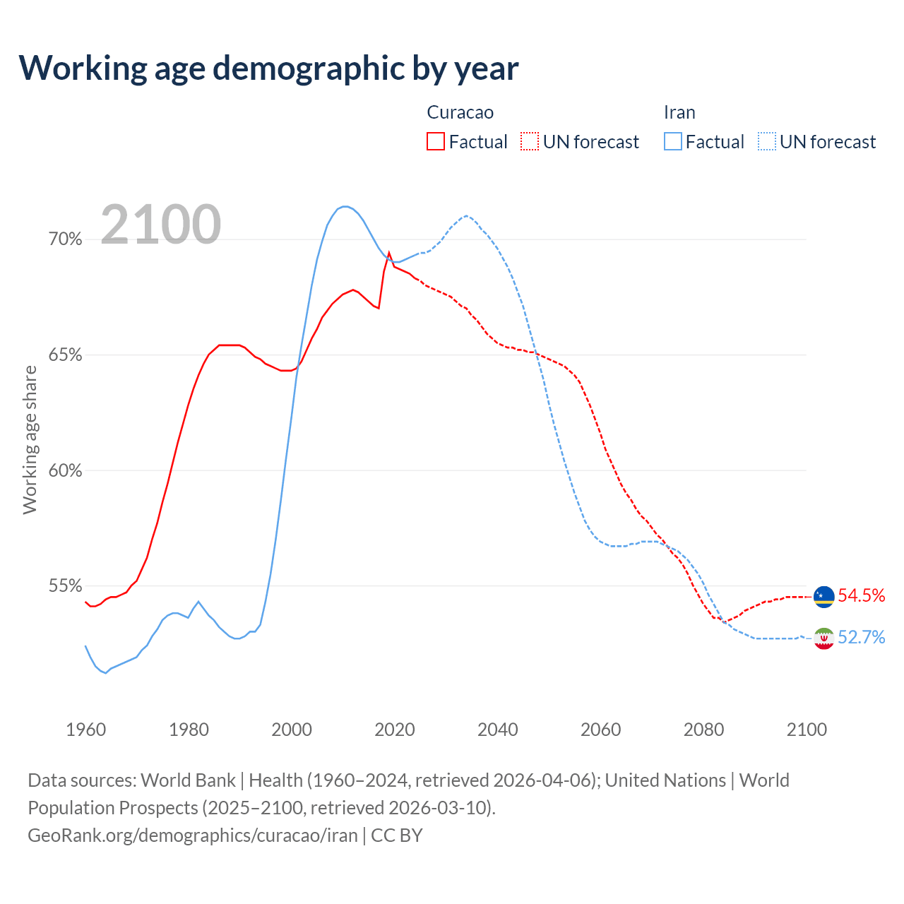 - Curacao has 107K working age adults (aged 15-64) vs 64.8M in Iran.