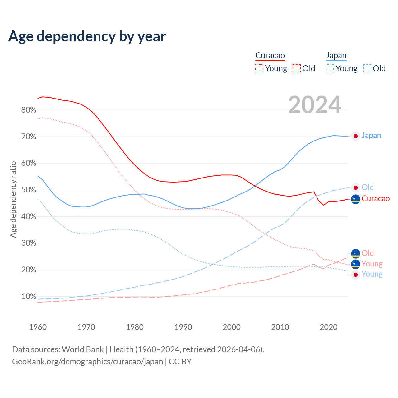 - Curacao is ranked 49/196 by median age (oldest to youngest) vs 2/196 for Japan.