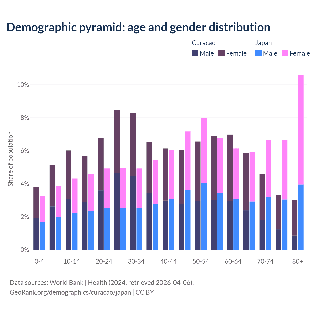 - The median age in Curacao is 39.5 years compared to 50.4 years in Japan.