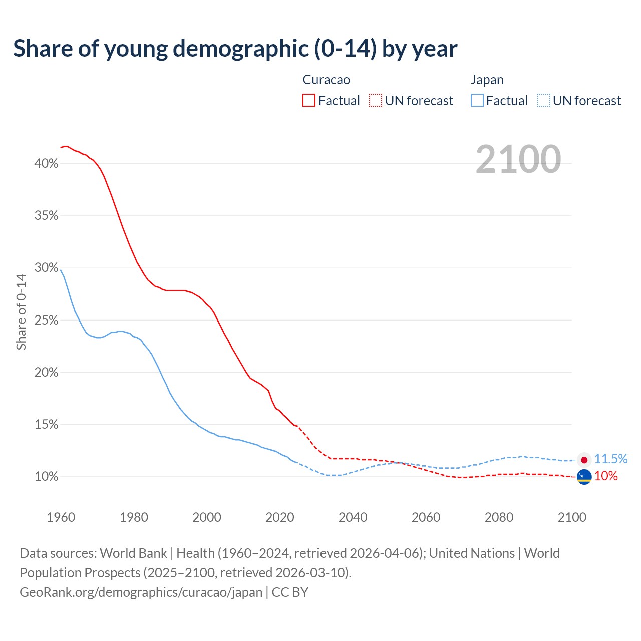 - The share of young demographic (0-15 years old) in Curacao is 14.9% vs 11.4% in Japan.