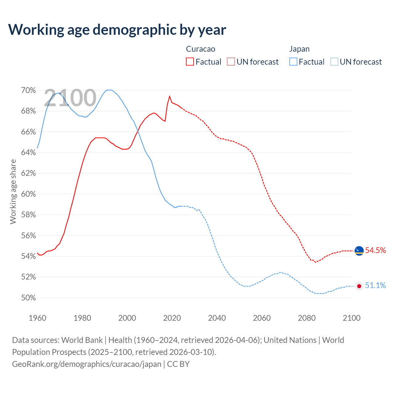 - Curacao has 107K working age adults (aged 15-64) vs 72.1M in Japan.