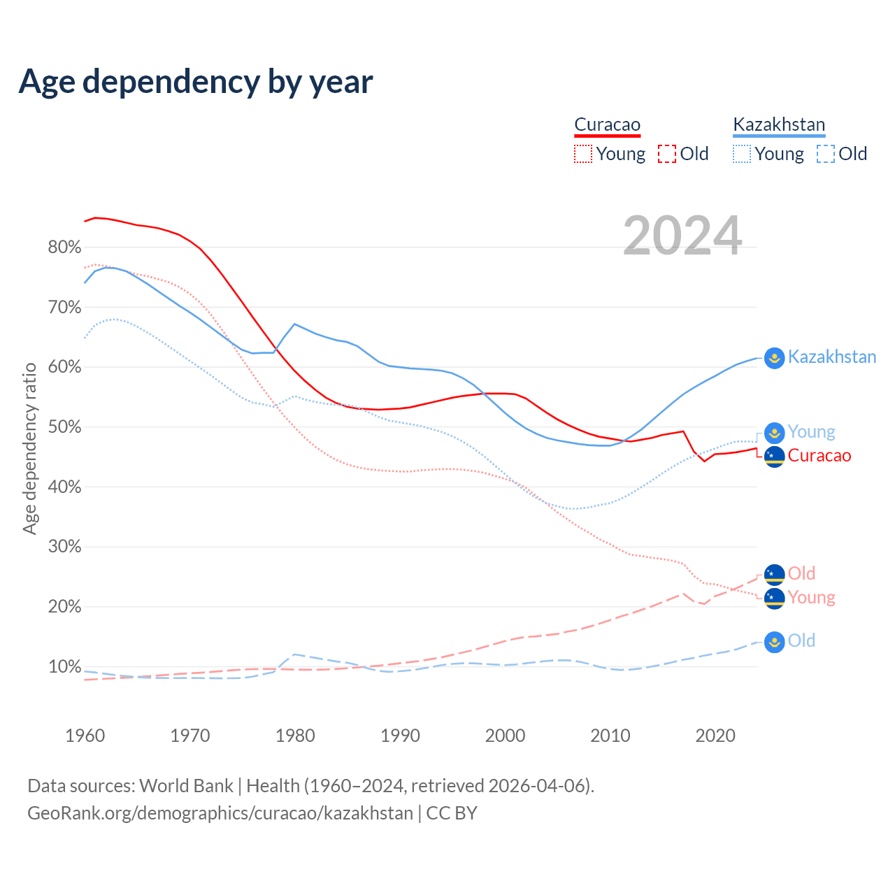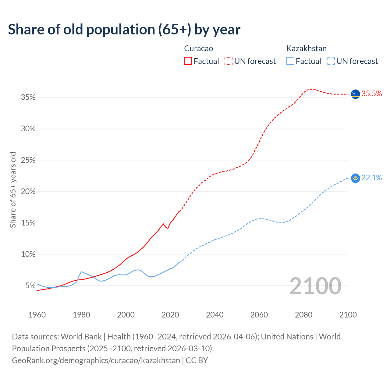 - The share of old-age demographic (65+) in Curacao is 16.8% vs 8.65% in Kazakhstan.