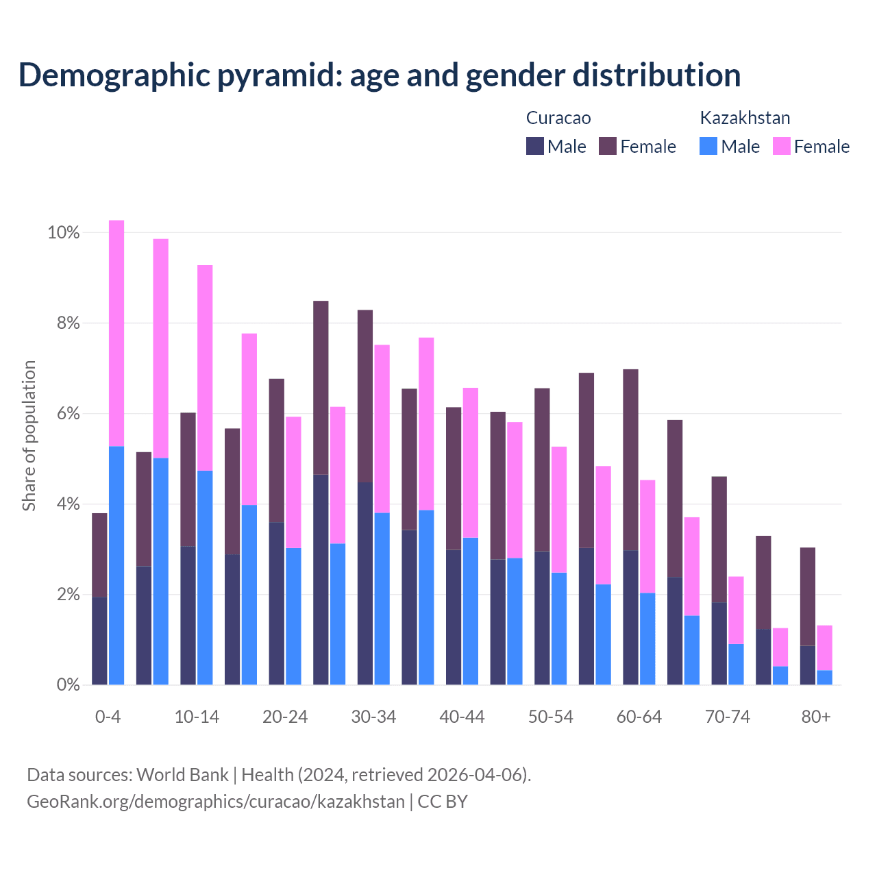 - Curacao is ranked 49/196 by median age (oldest to youngest) vs 99/196 for Kazakhstan.
