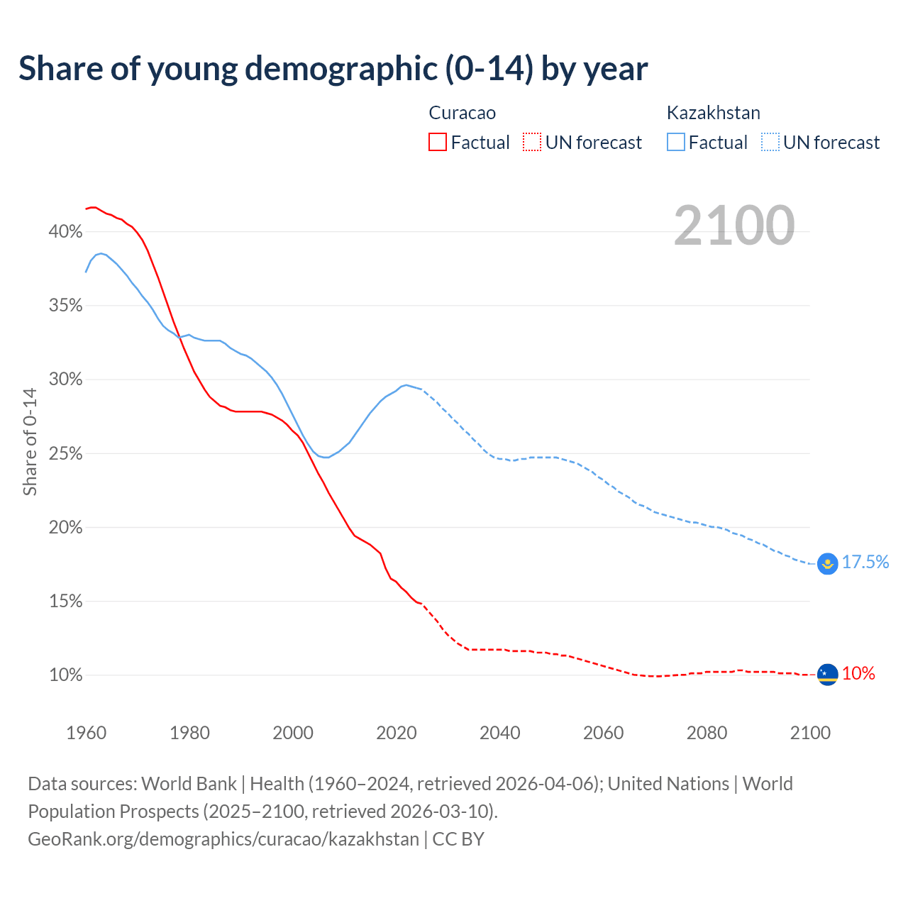 - The share of young demographic (0-15 years old) in Curacao is 14.9% vs 29.4% in Kazakhstan.