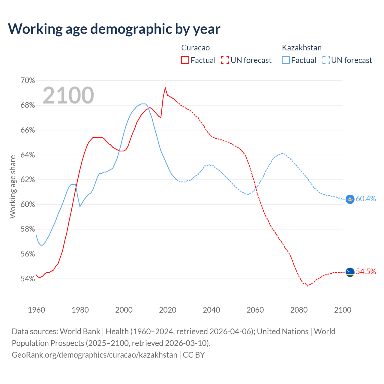Median age Curacao vs Kazakhstan, 1960-2100