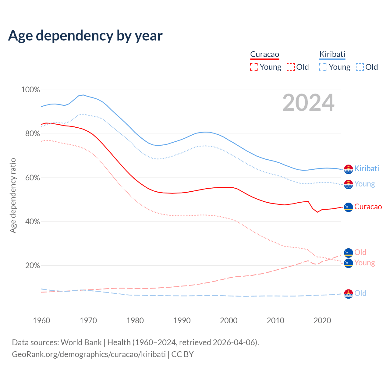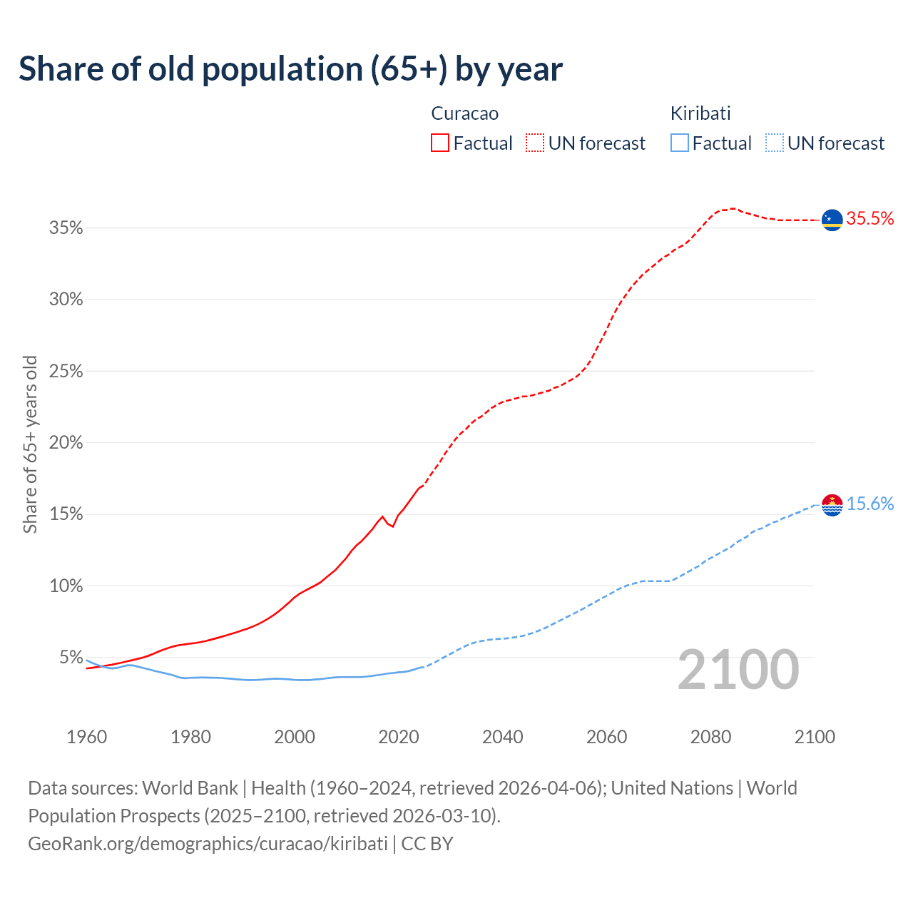 - The share of old-age demographic (65+) in Curacao is 16.8% vs 4.24% in Kiribati.