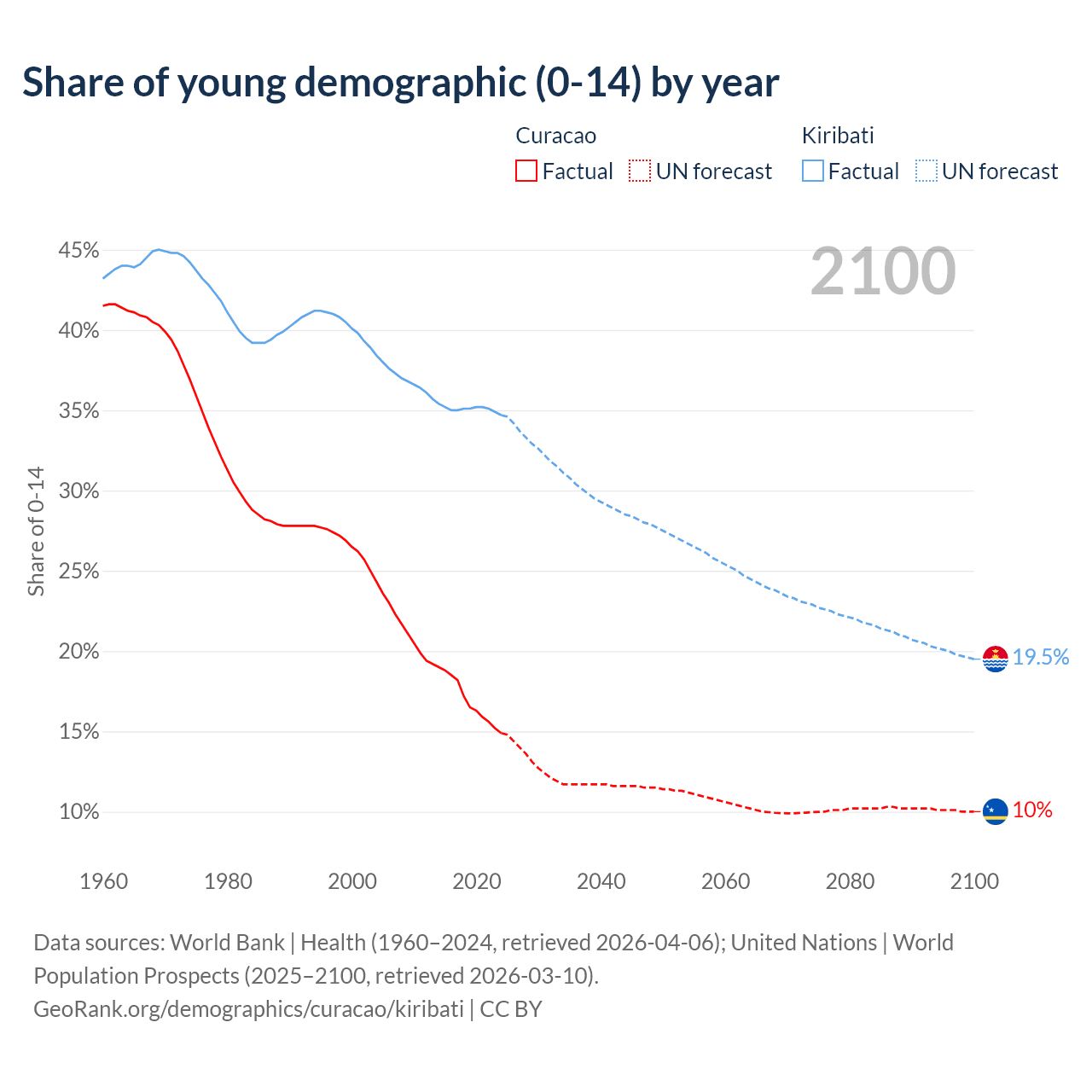 - The share of young demographic (0-15 years old) in Curacao is 14.9% vs 34.7% in Kiribati.