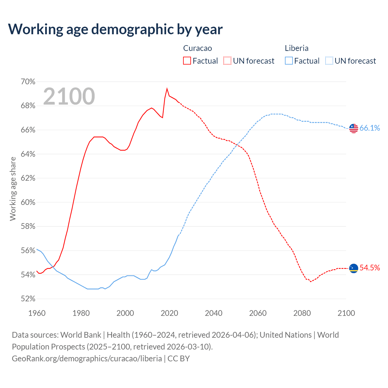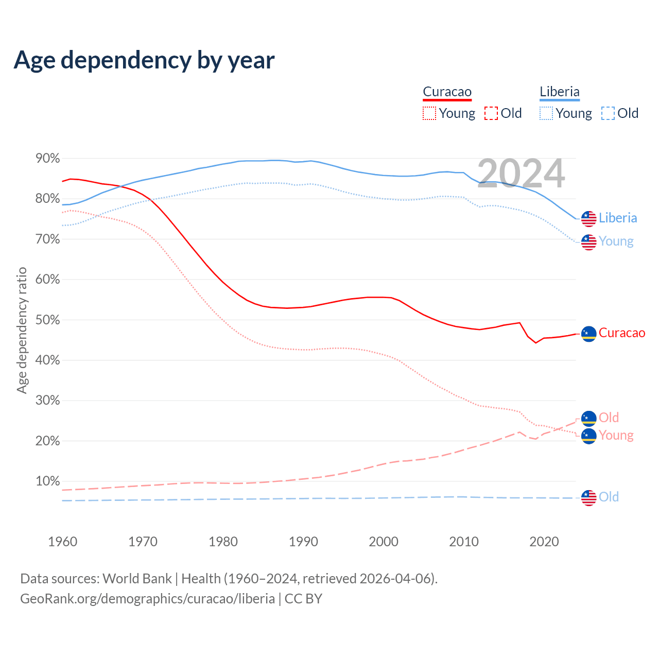 - The share of old-age demographic (65+) in Curacao is 16.8% vs 3.3% in Liberia.