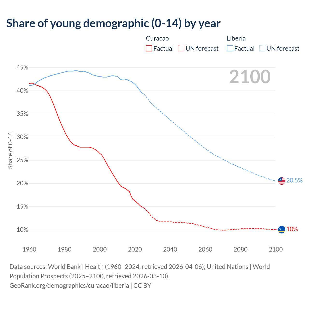 - The share of young demographic (0-15 years old) in Curacao is 14.9% vs 39.5% in Liberia.