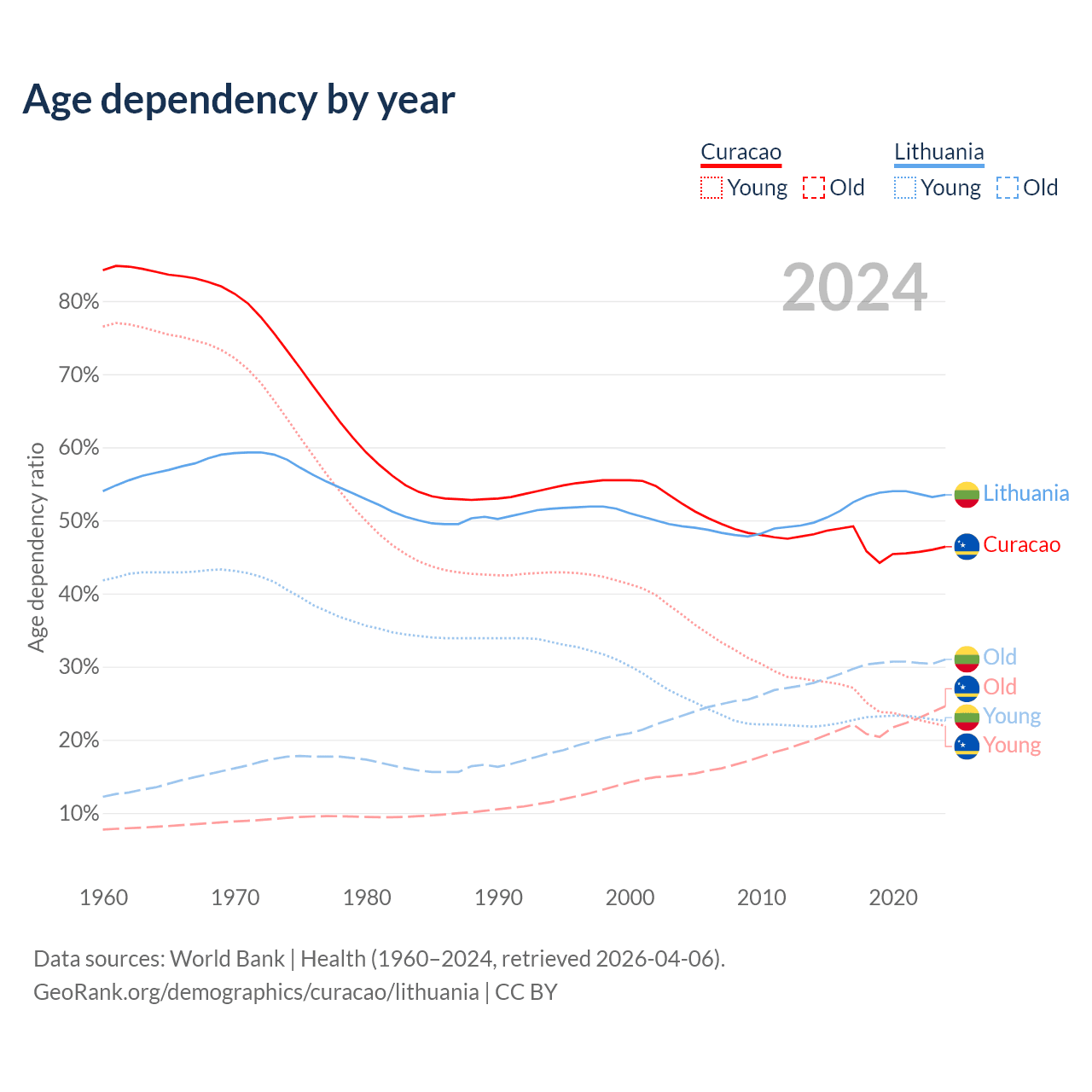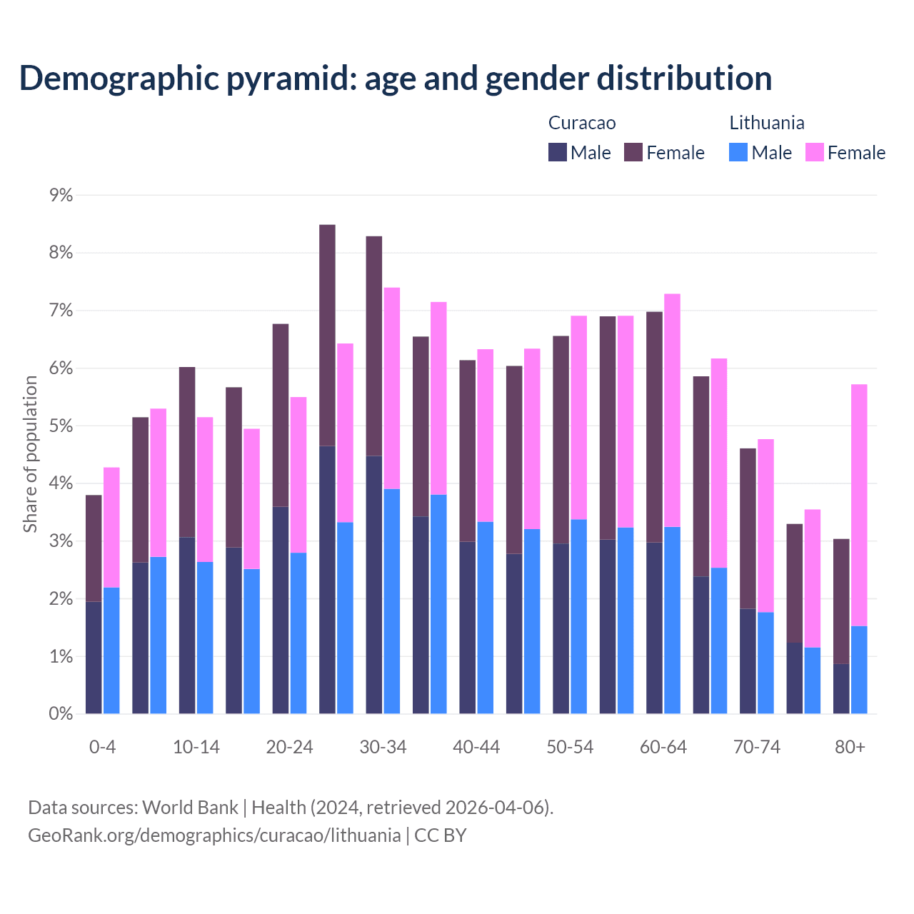 - The share of old-age demographic (65+) in Curacao is 16.8% vs 20.2% in Lithuania.