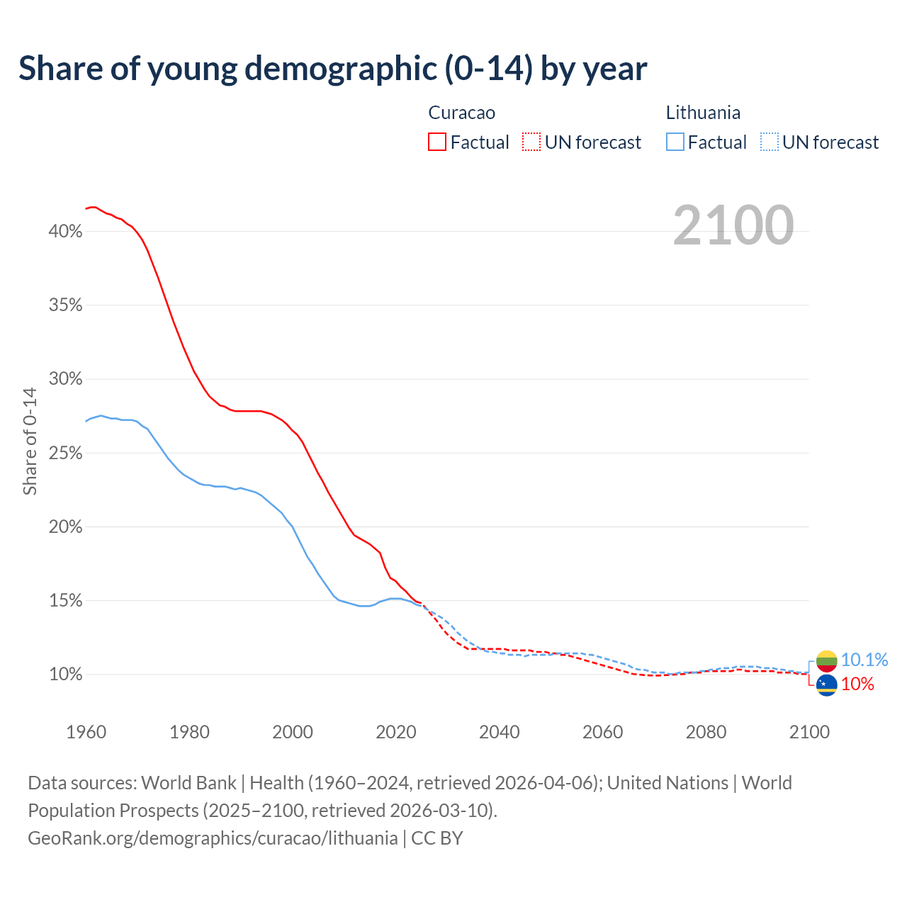 - The share of young demographic (0-15 years old) in Curacao is 14.9% vs 14.7% in Lithuania.