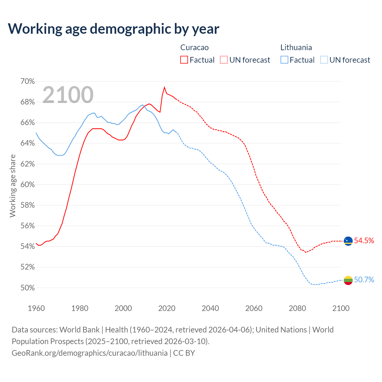 - Curacao has 107K working age adults (aged 15-64) vs 1.84M in Lithuania.
