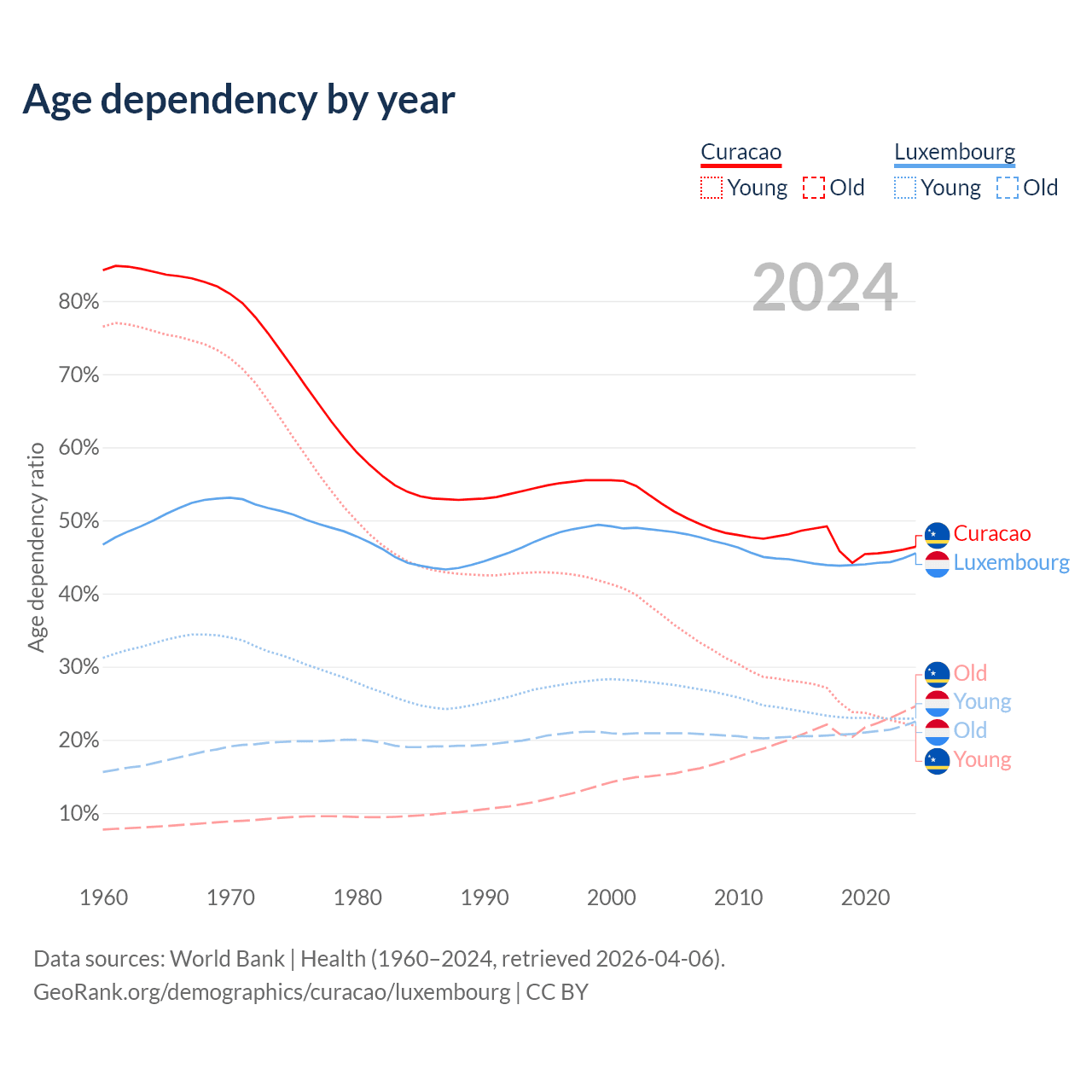 - The share of old-age demographic (65+) in Curacao is 16.8% vs 15.5% in Luxembourg.