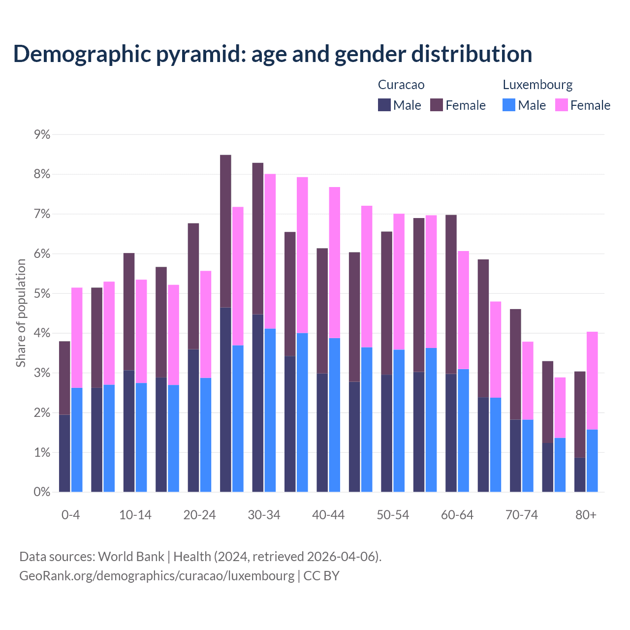 - The share of young demographic (0-15 years old) in Curacao is 14.9% vs 15.8% in Luxembourg.