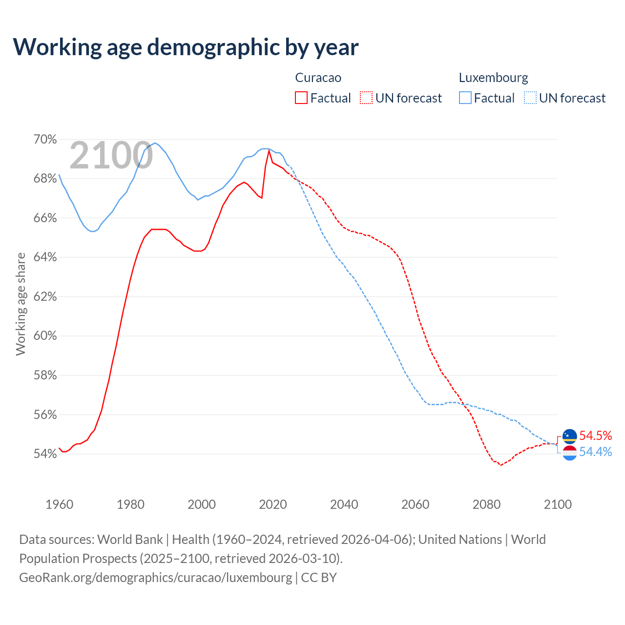 - Curacao has 107K working age adults (aged 15-64) vs 477K in Luxembourg.