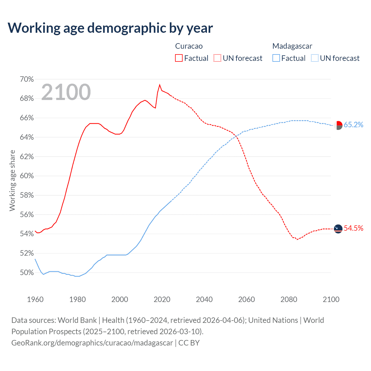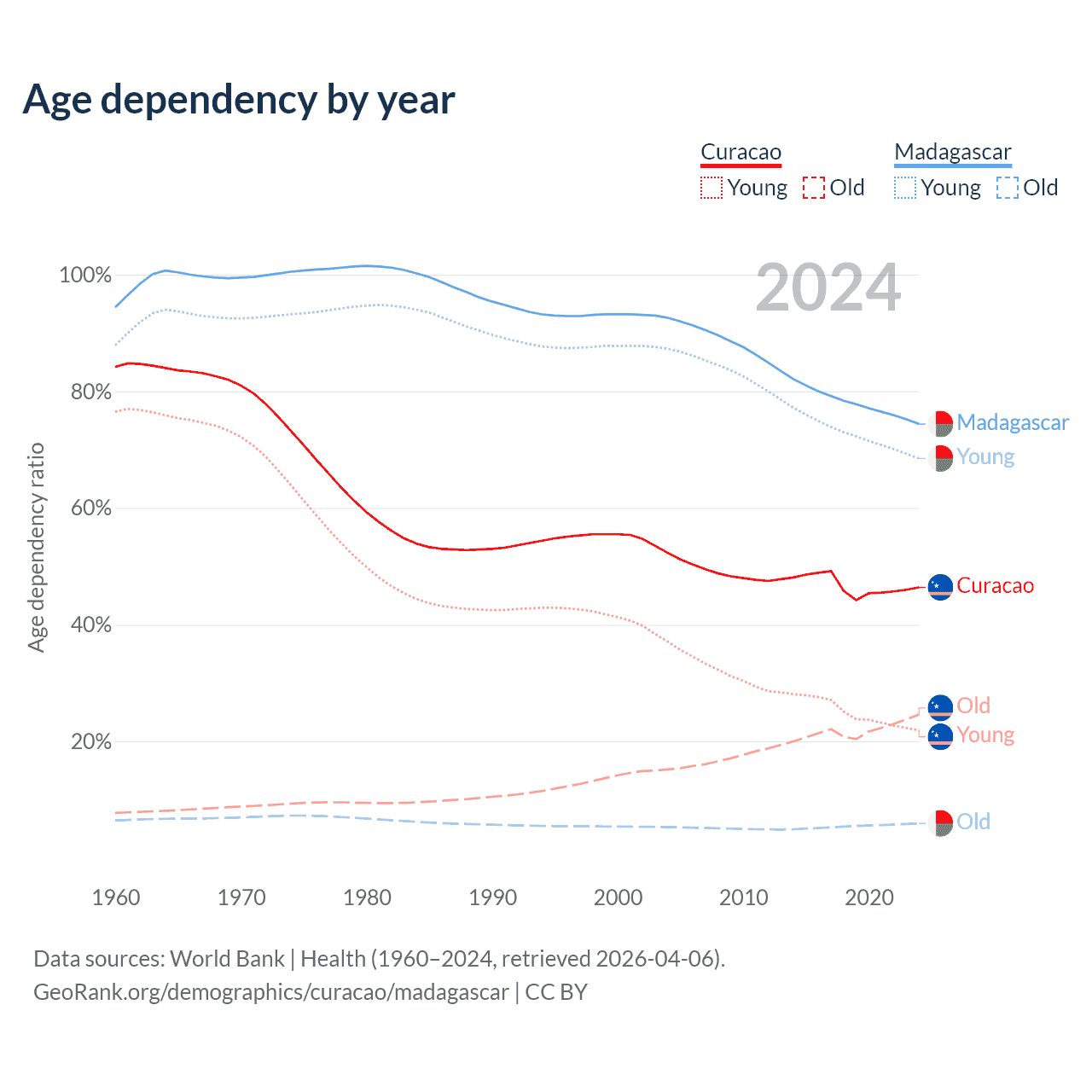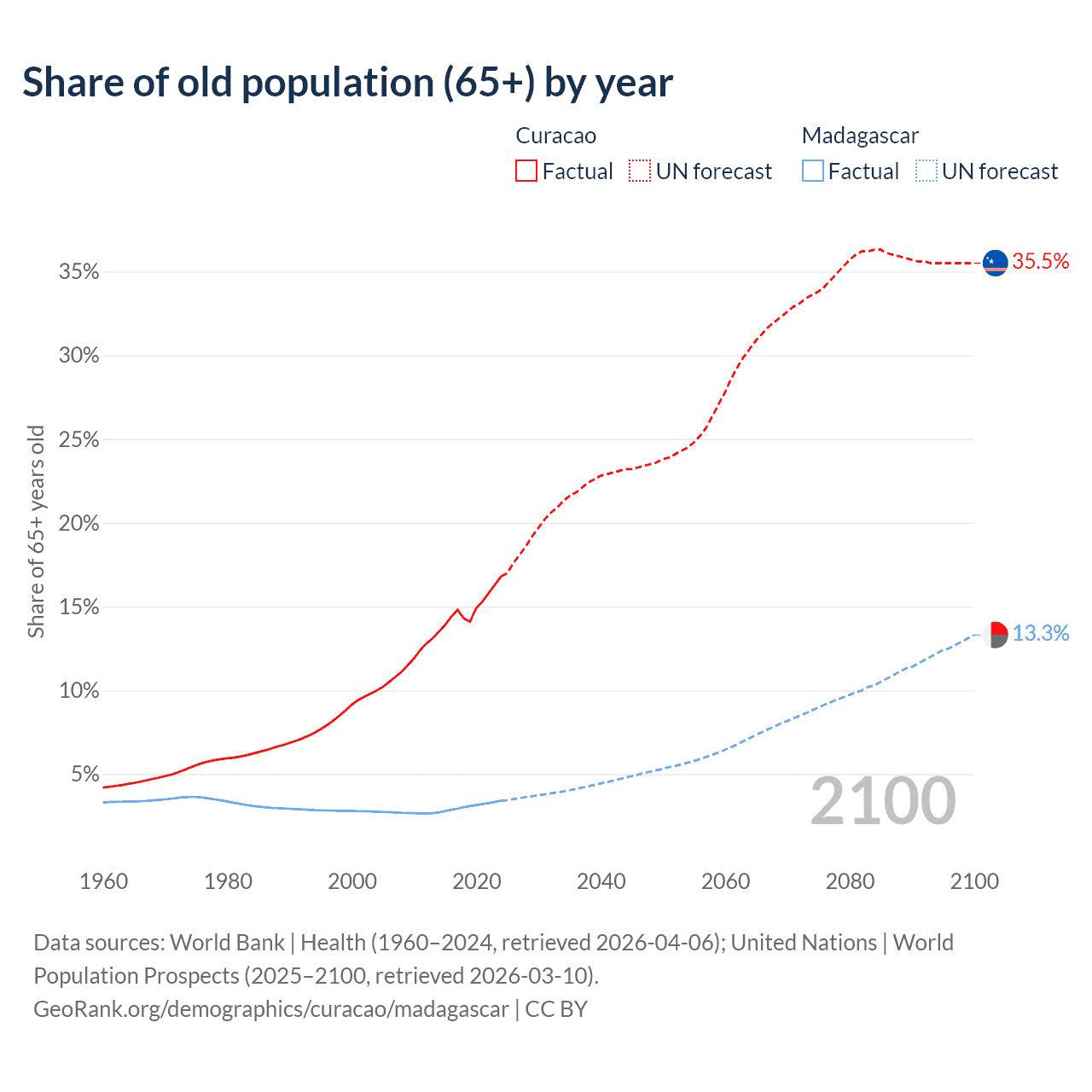 - The share of old-age demographic (65+) in Curacao is 16.8% vs 3.41% in Madagascar.