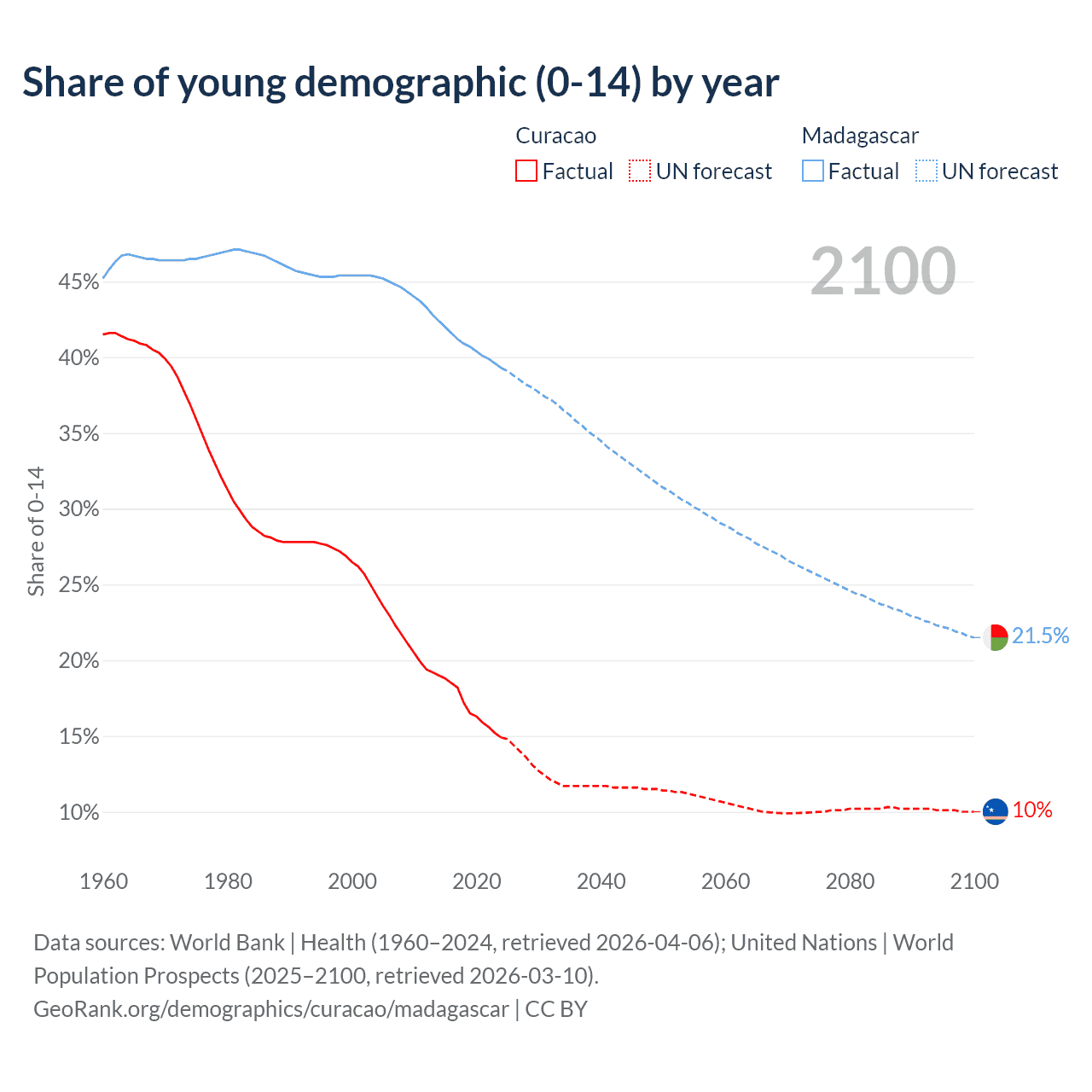 - The share of young demographic (0-15 years old) in Curacao is 14.9% vs 39.3% in Madagascar.