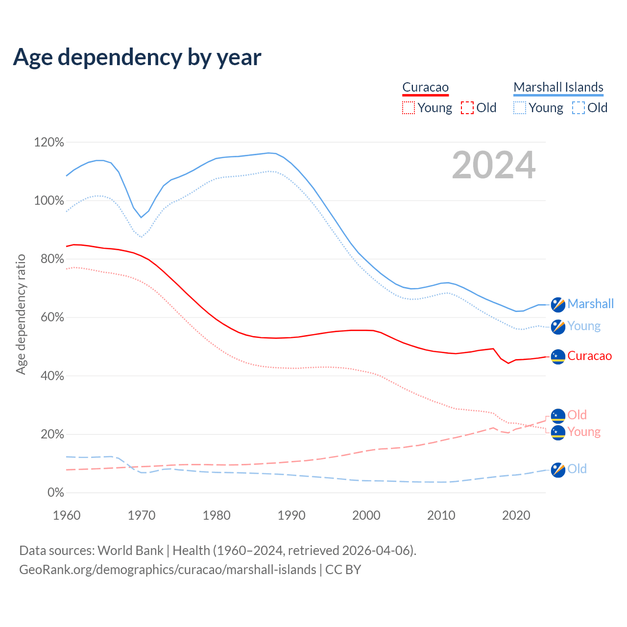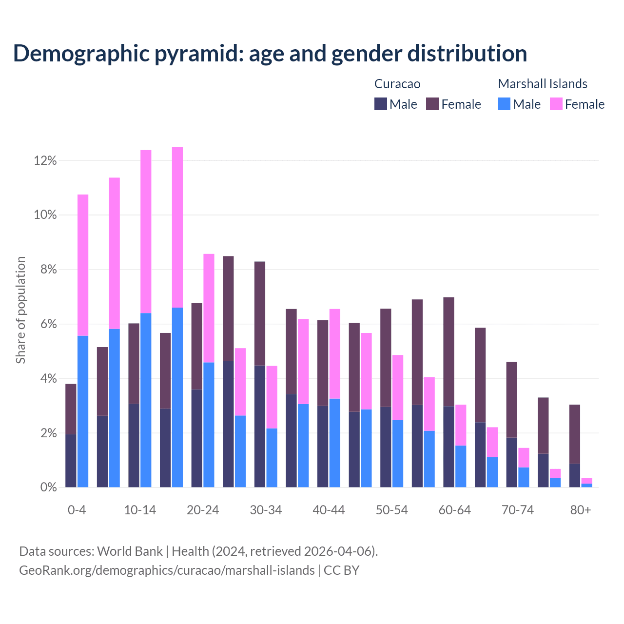 - The share of old-age demographic (65+) in Curacao is 16.8% vs 4.64% in the Marshall Islands.