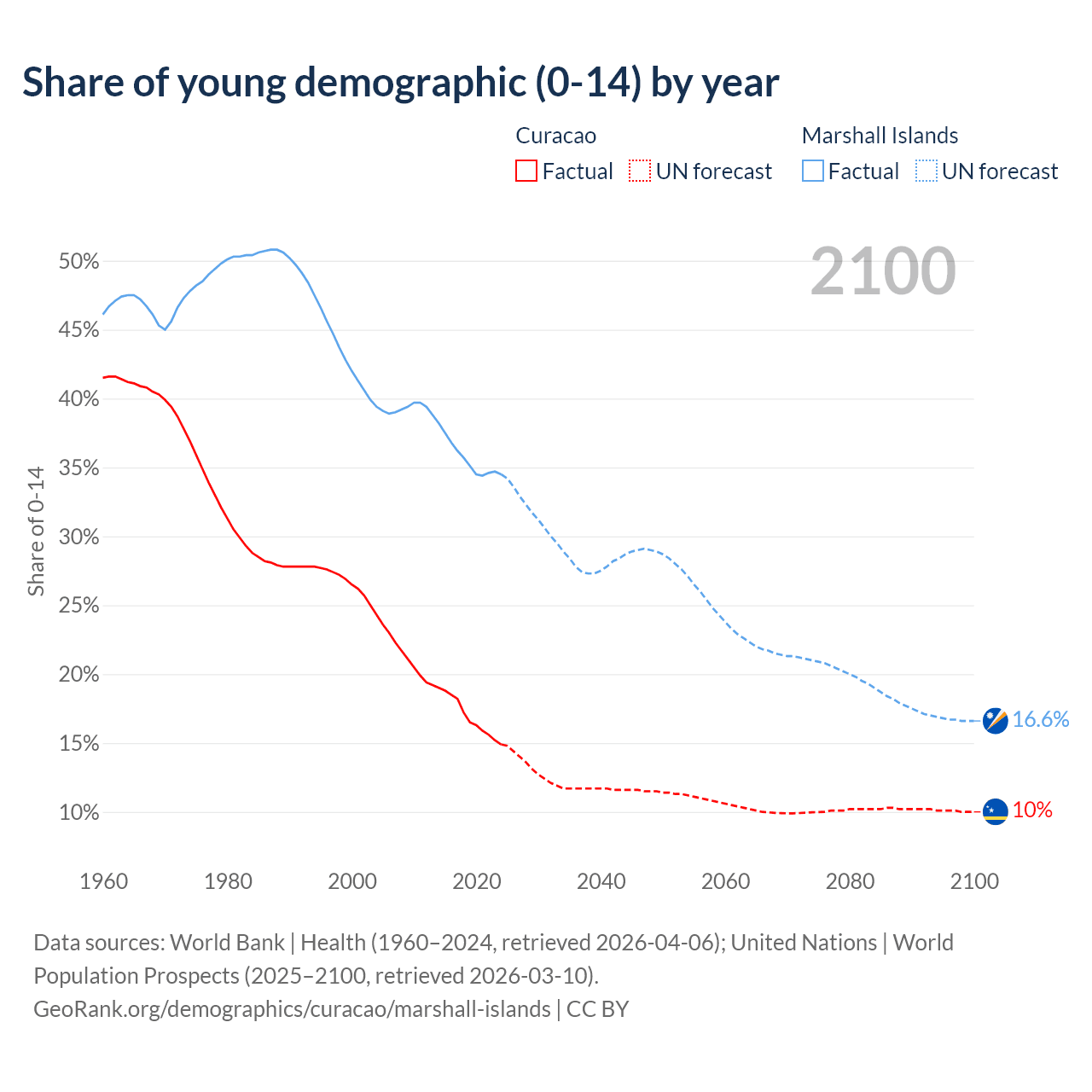 - The share of young demographic (0-15 years old) in Curacao is 14.9% vs 34.5% in the Marshall Islands.