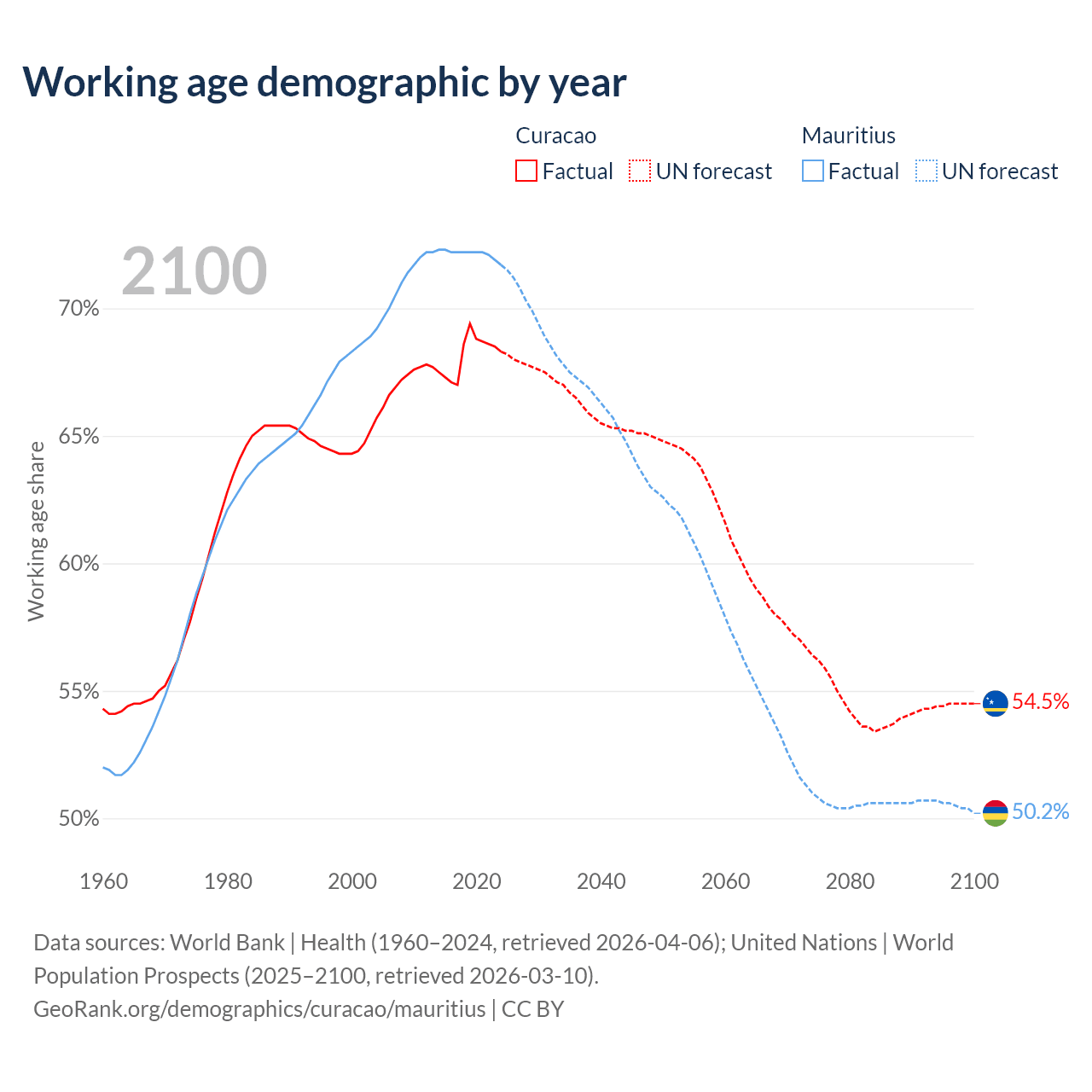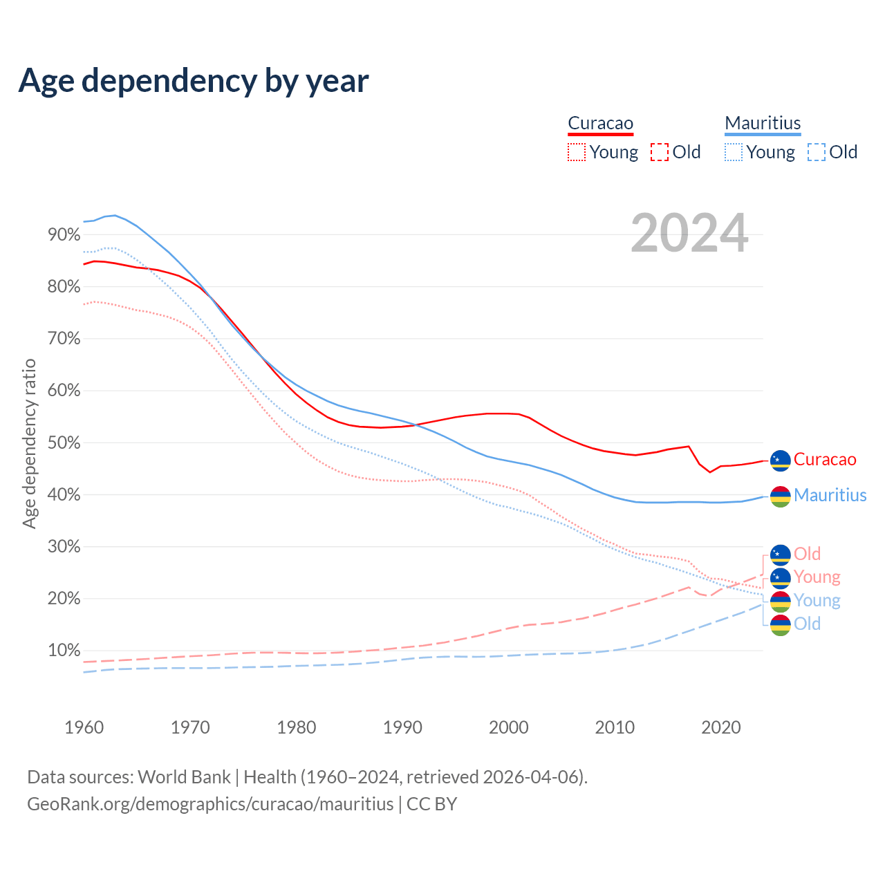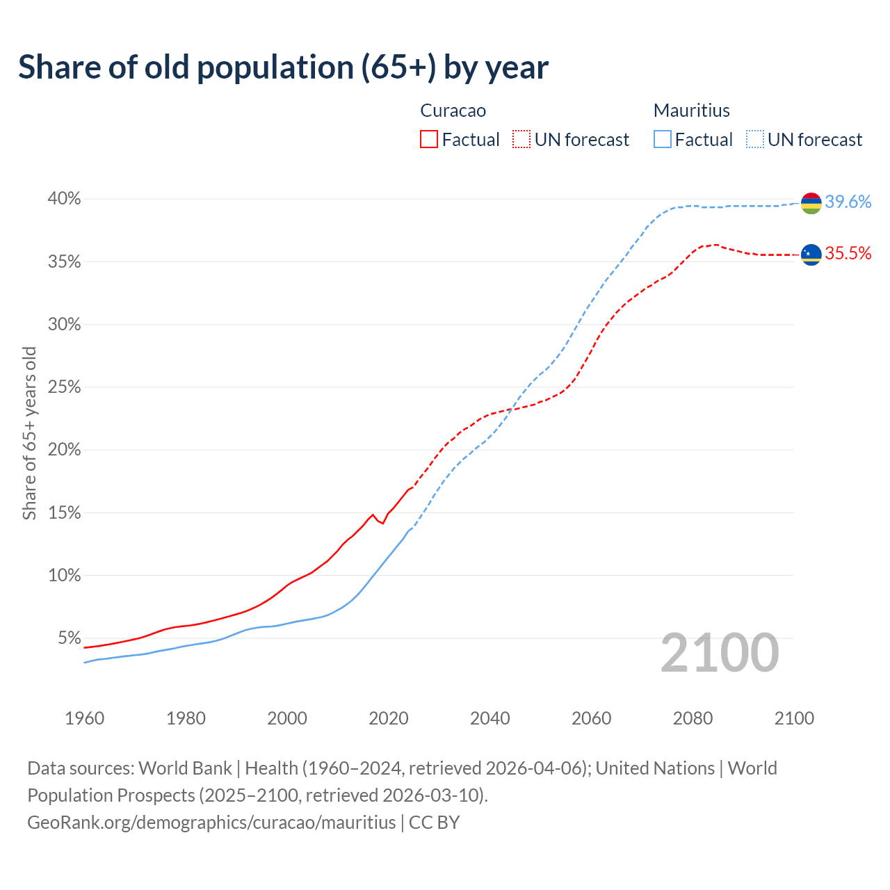 - The share of old-age demographic (65+) in Curacao is 16.8% vs 13.5% in Mauritius.