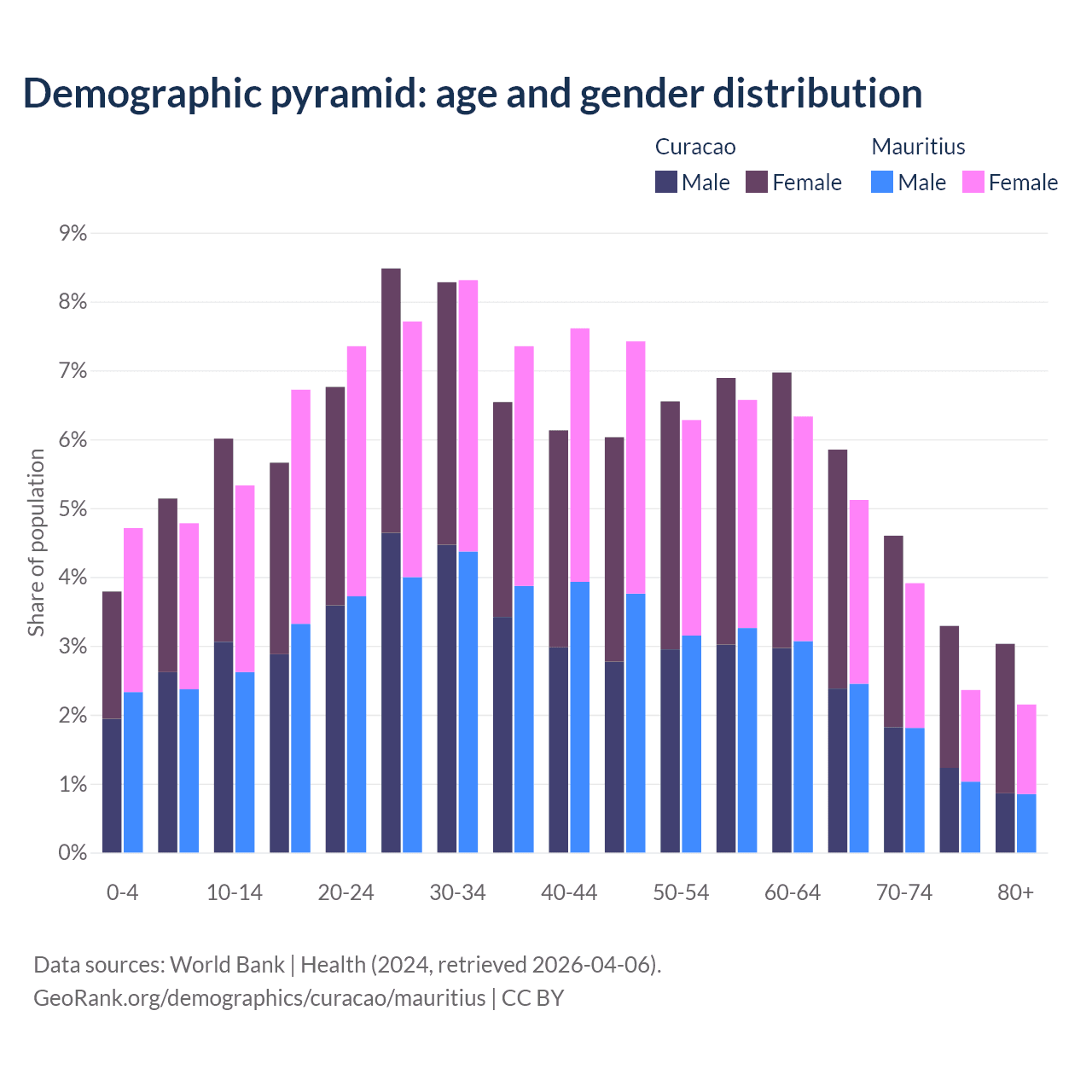- Curacao is ranked 49/196 by median age (oldest to youngest) vs 57/196 for Mauritius.