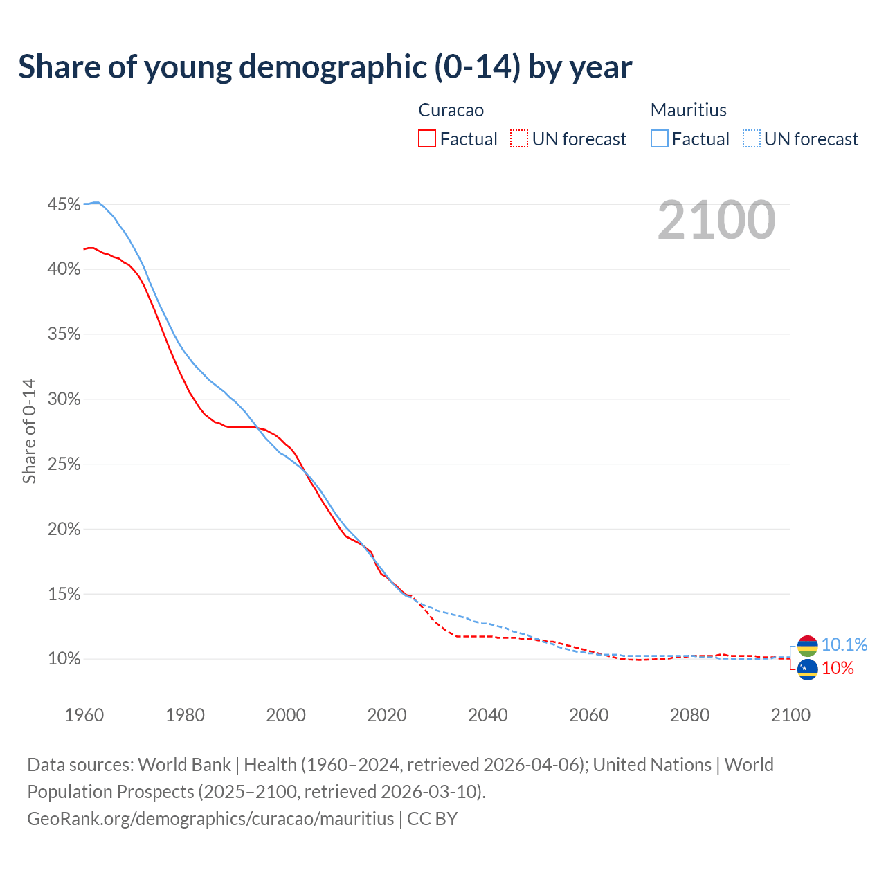 - The share of young demographic (0-15 years old) in Curacao is 14.9% vs 14.8% in Mauritius.