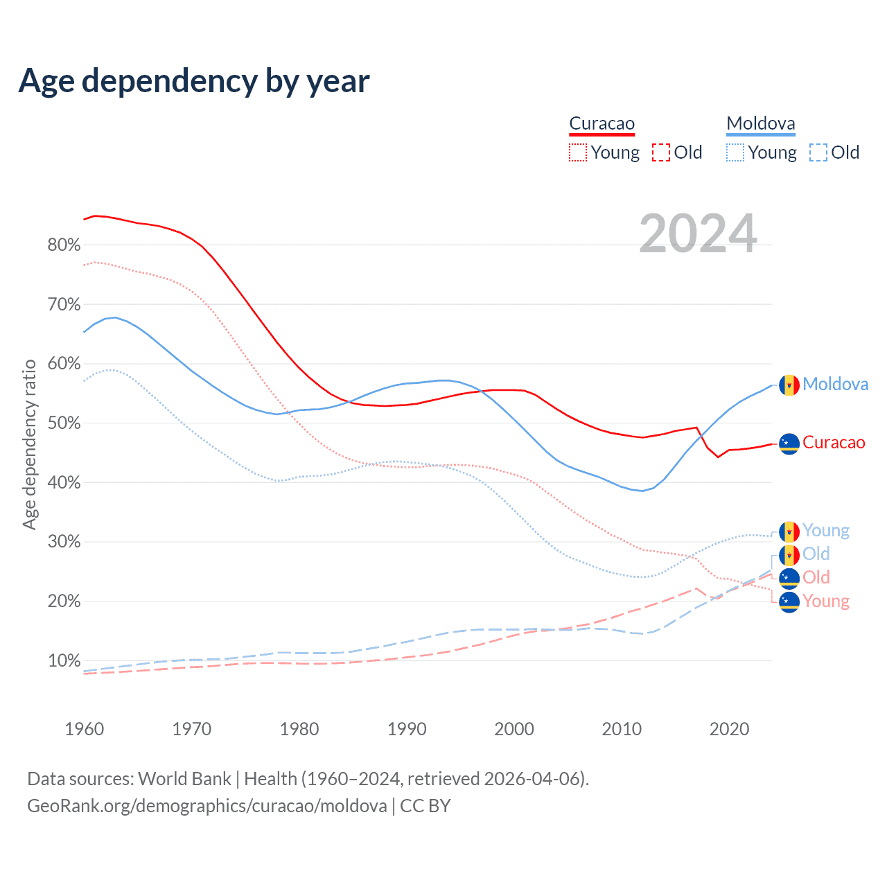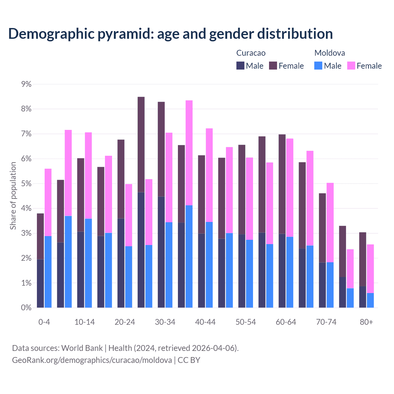 - The share of old-age demographic (65+) in Curacao is 16.8% vs 16.2% in Moldova.