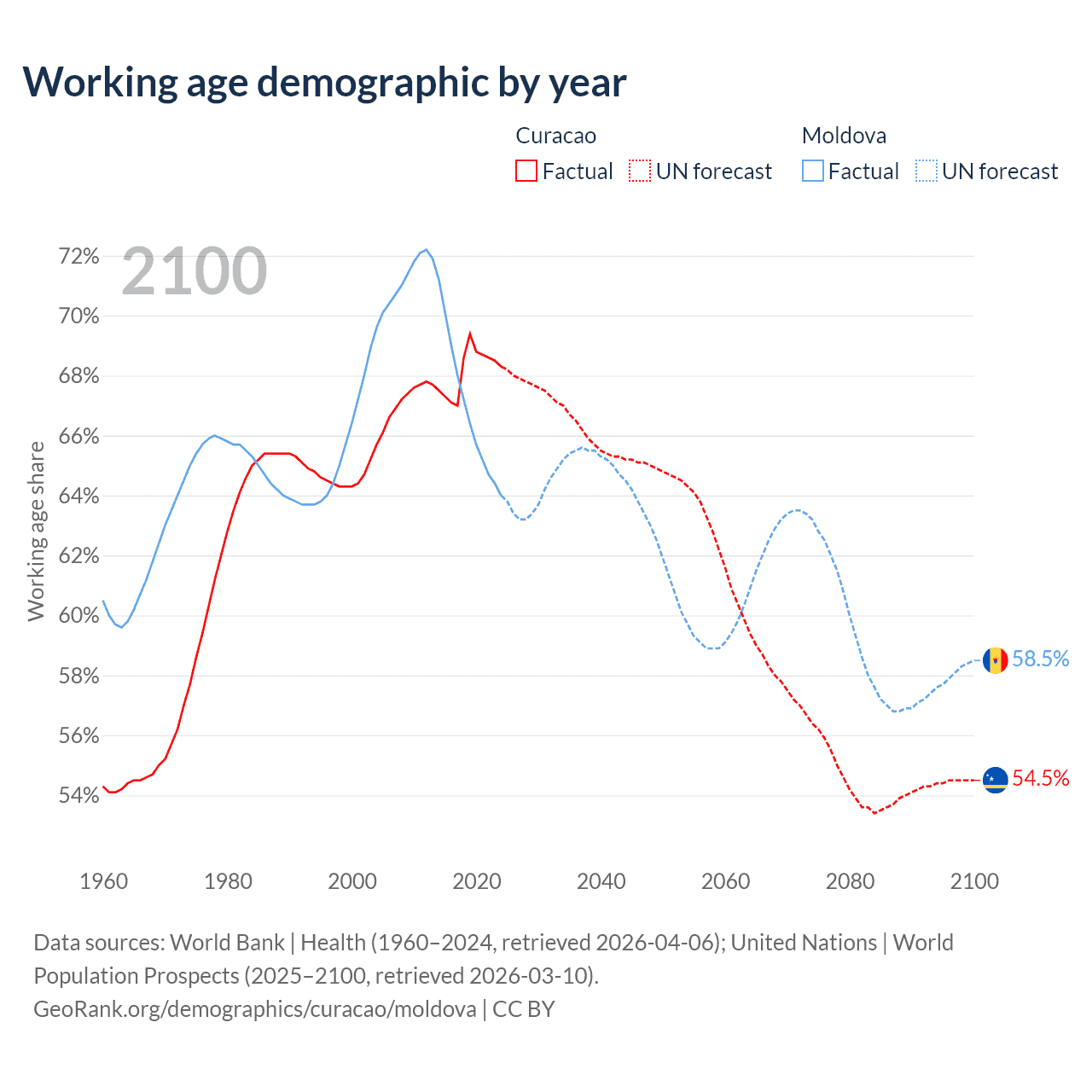 - The share of young demographic (0-15 years old) in Curacao is 14.9% vs 19.8% in Moldova.