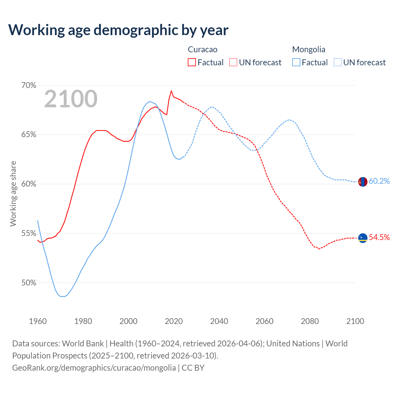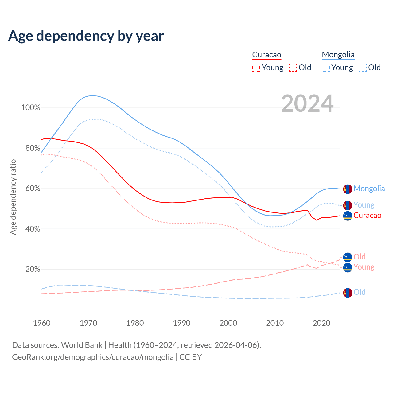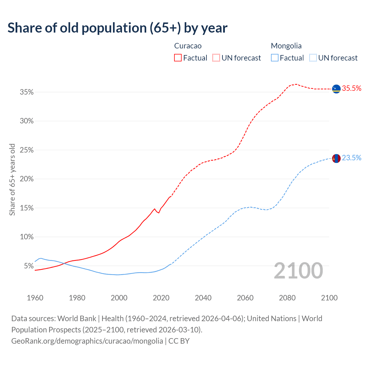 - The share of old-age demographic (65+) in Curacao is 16.8% vs 5.14% in Mongolia.