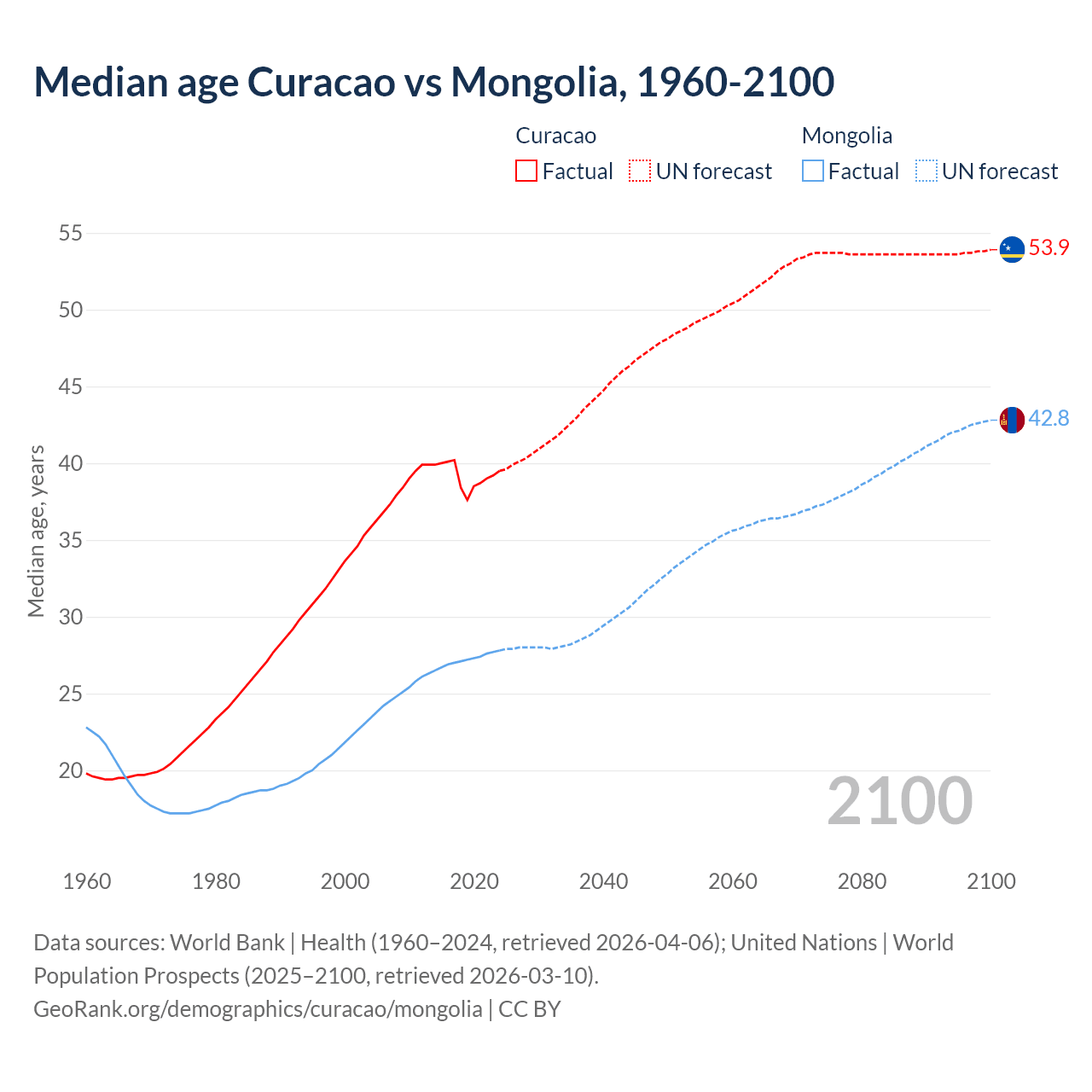 Median age Curacao vs Mongolia, 1960-2100