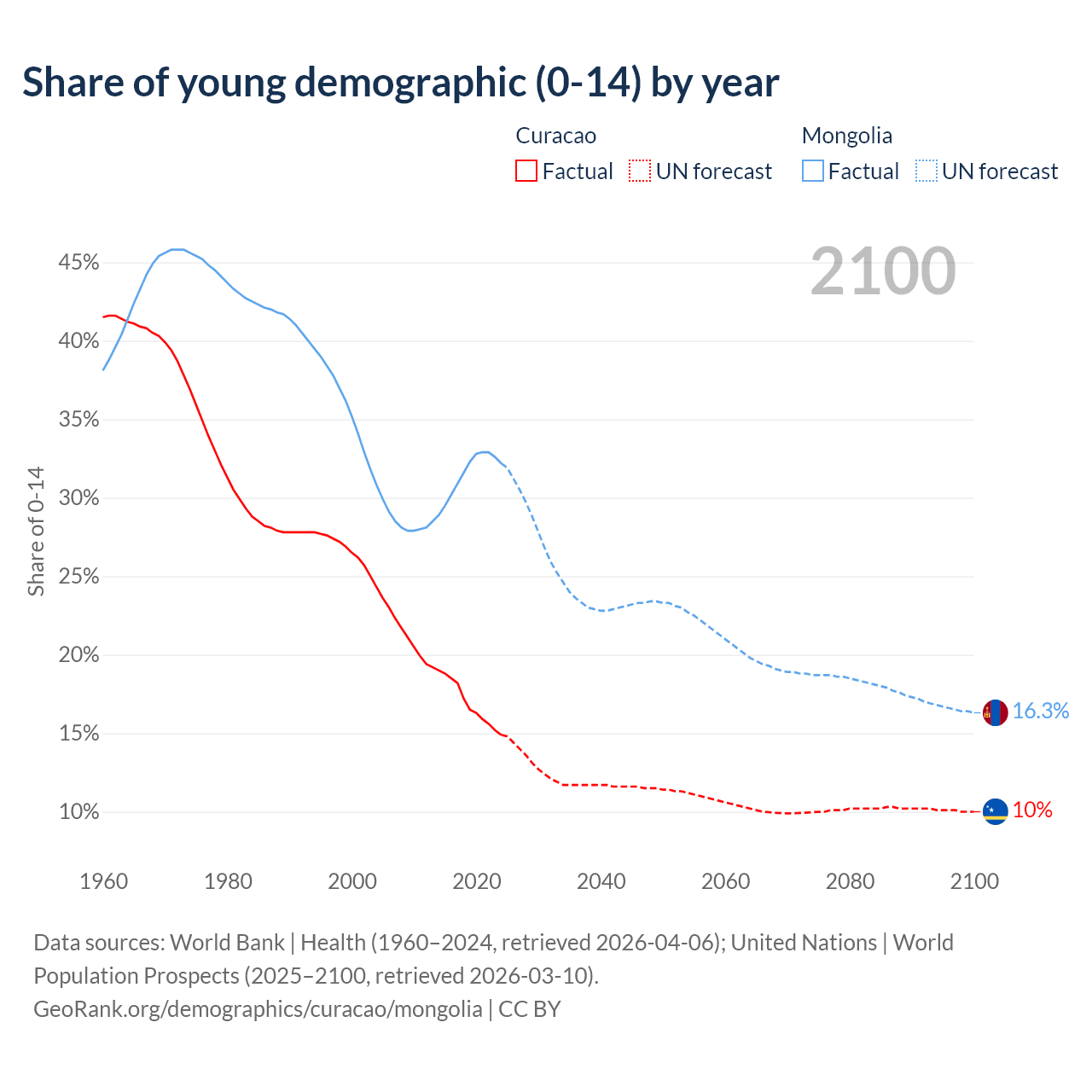 - The share of young demographic (0-15 years old) in Curacao is 14.9% vs 32.2% in Mongolia.