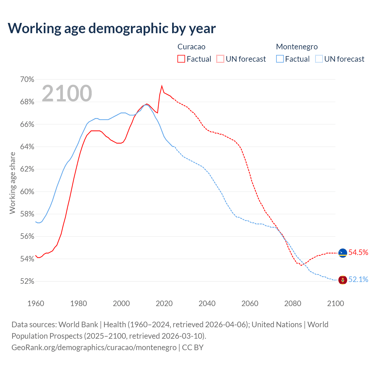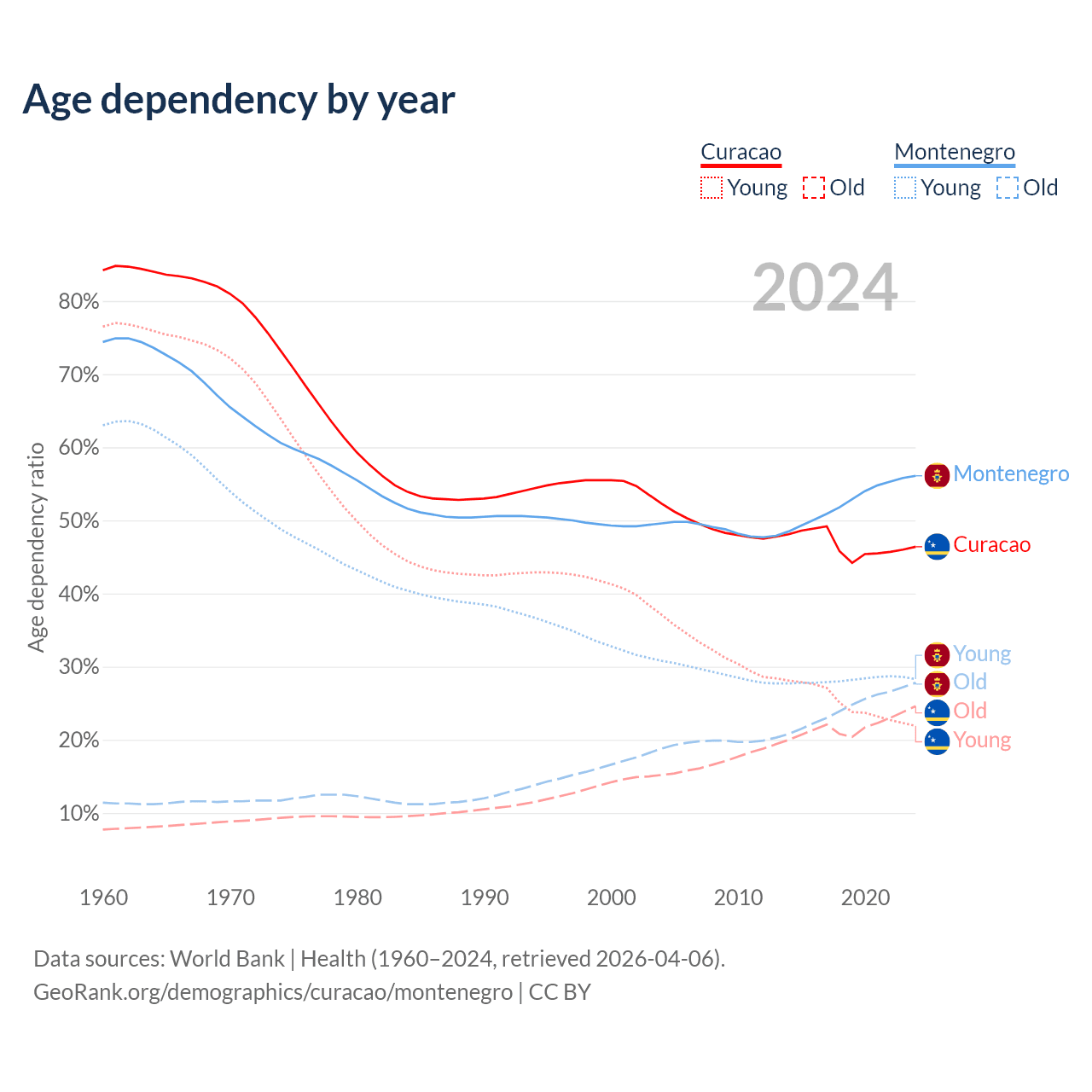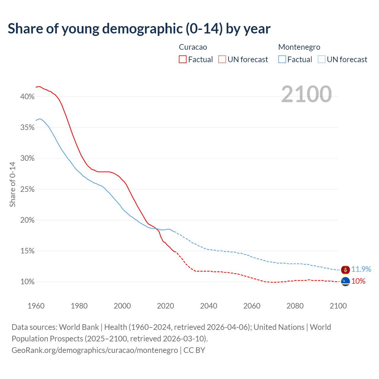 - The share of young demographic (0-15 years old) in Curacao is 14.9% vs 18.1% in Montenegro.