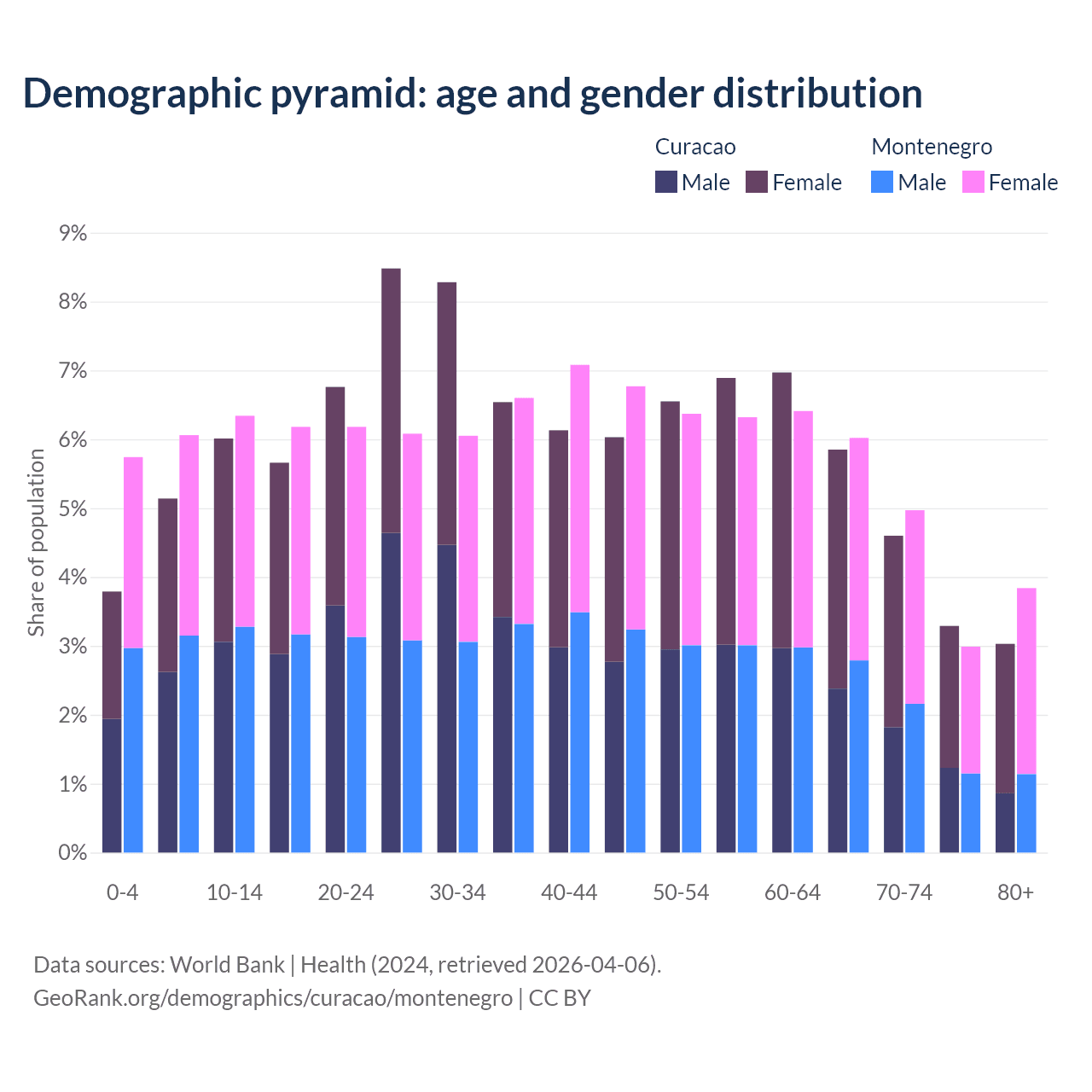 - The median age in Curacao is 39.5 years compared to 40.6 years in Montenegro.