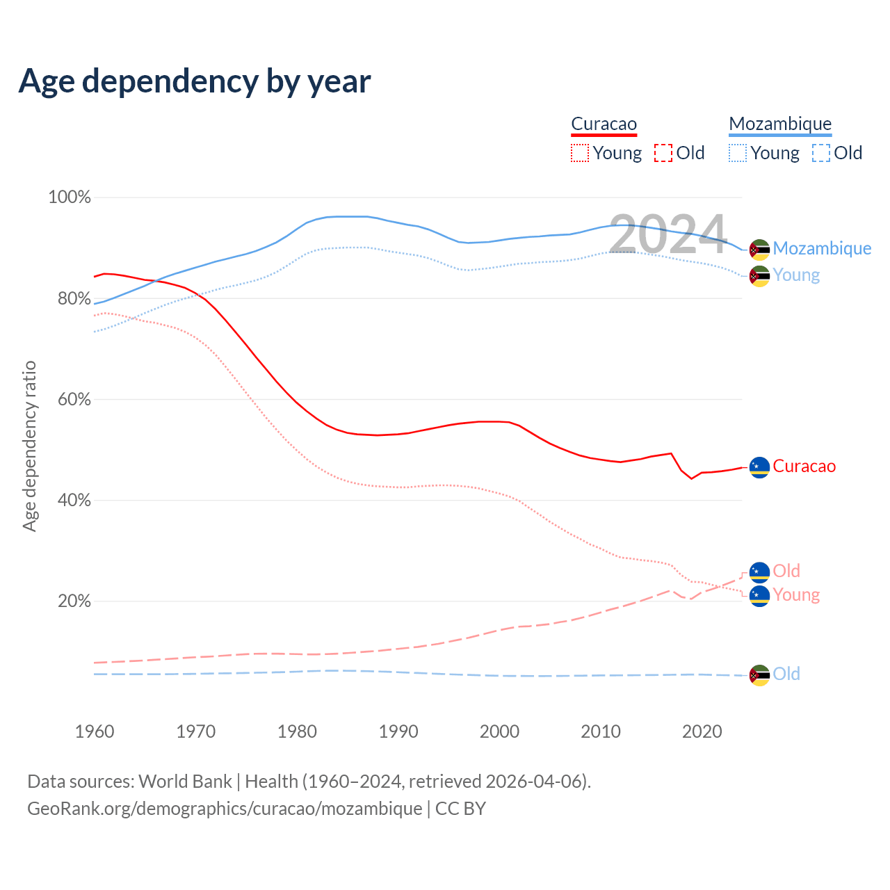 - The share of old-age demographic (65+) in Curacao is 16.8% vs 2.75% in Mozambique.