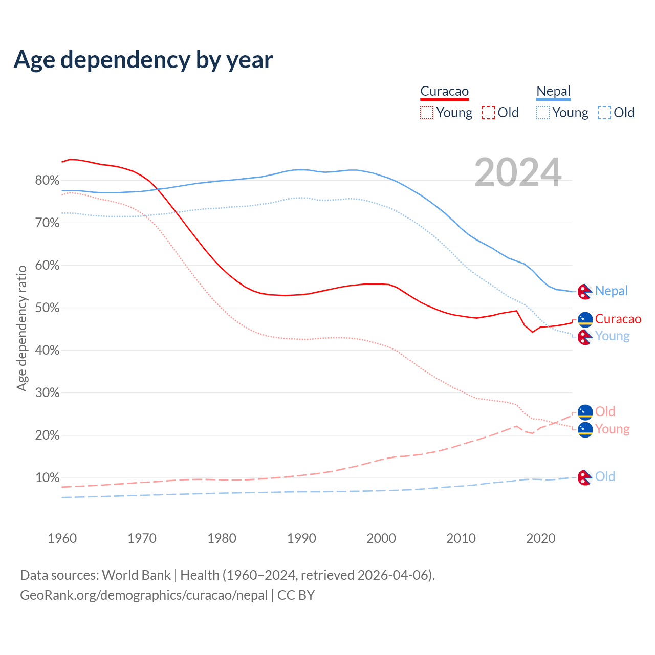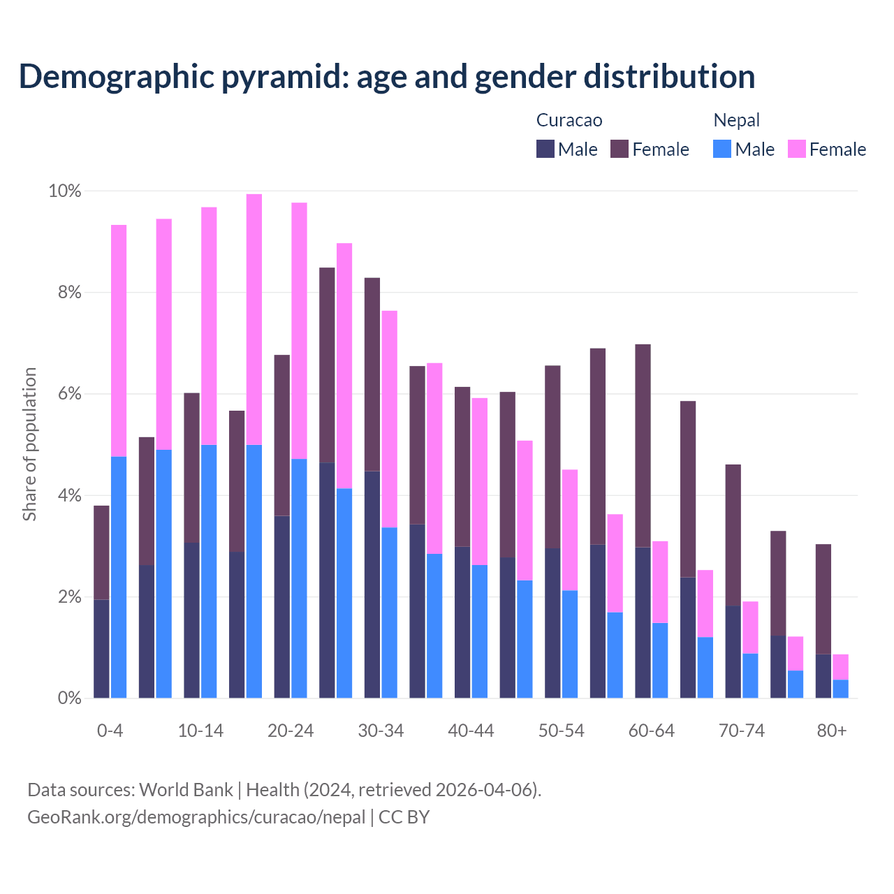 - The share of old-age demographic (65+) in Curacao is 16.8% vs 6.5% in Nepal.