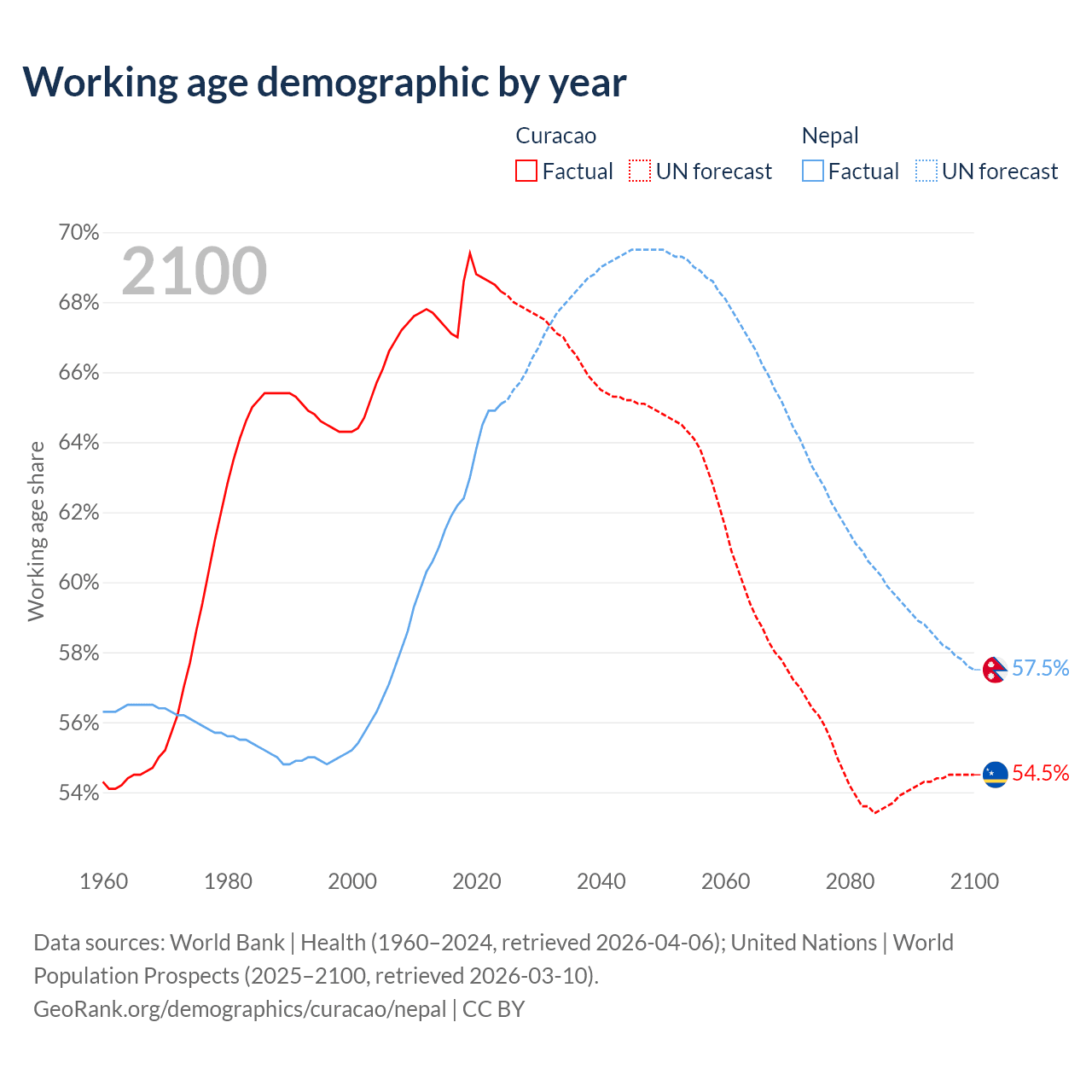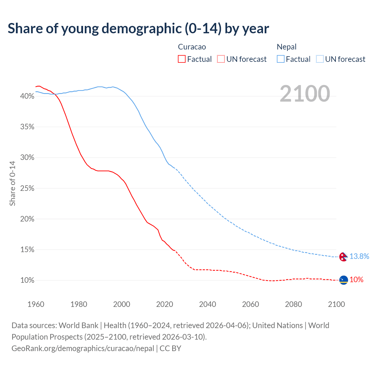- The share of young demographic (0-15 years old) in Curacao is 14.9% vs 28.4% in Nepal.