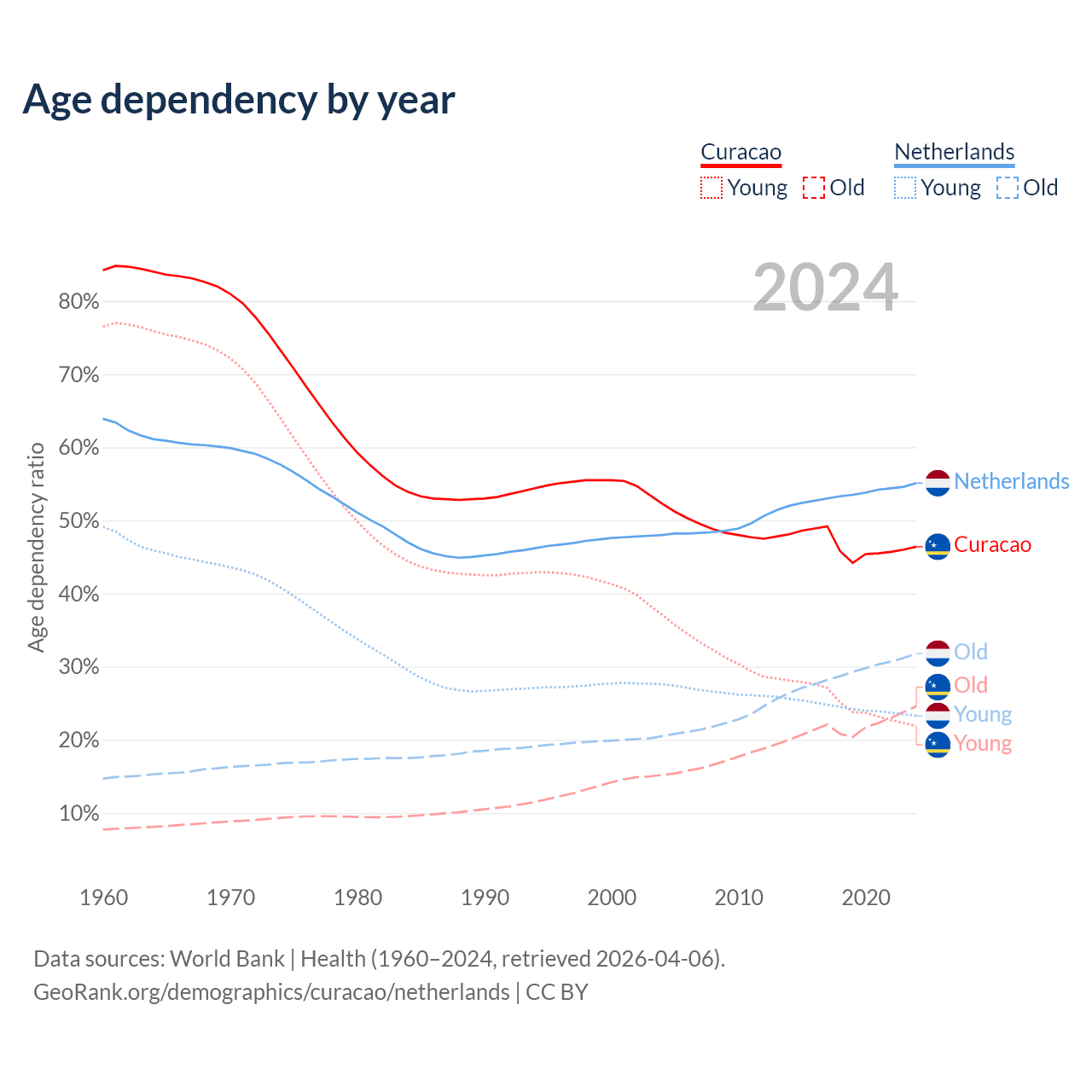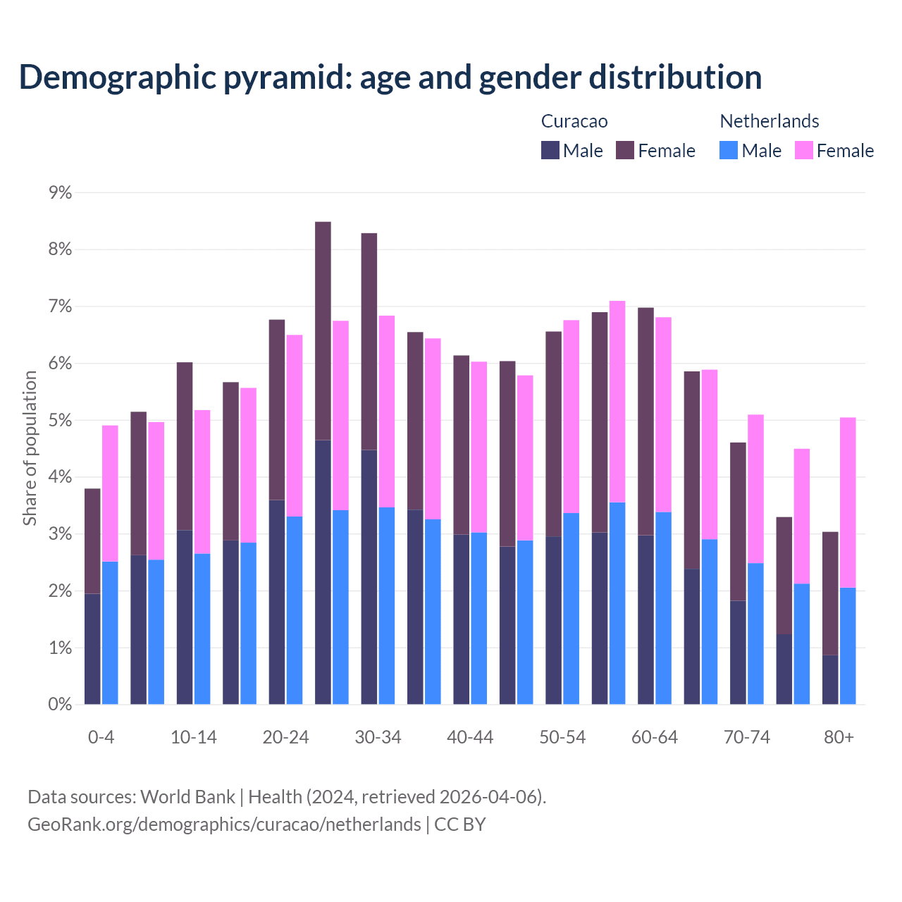 - The share of old-age demographic (65+) in Curacao is 16.8% vs 20.5% in the Netherlands.