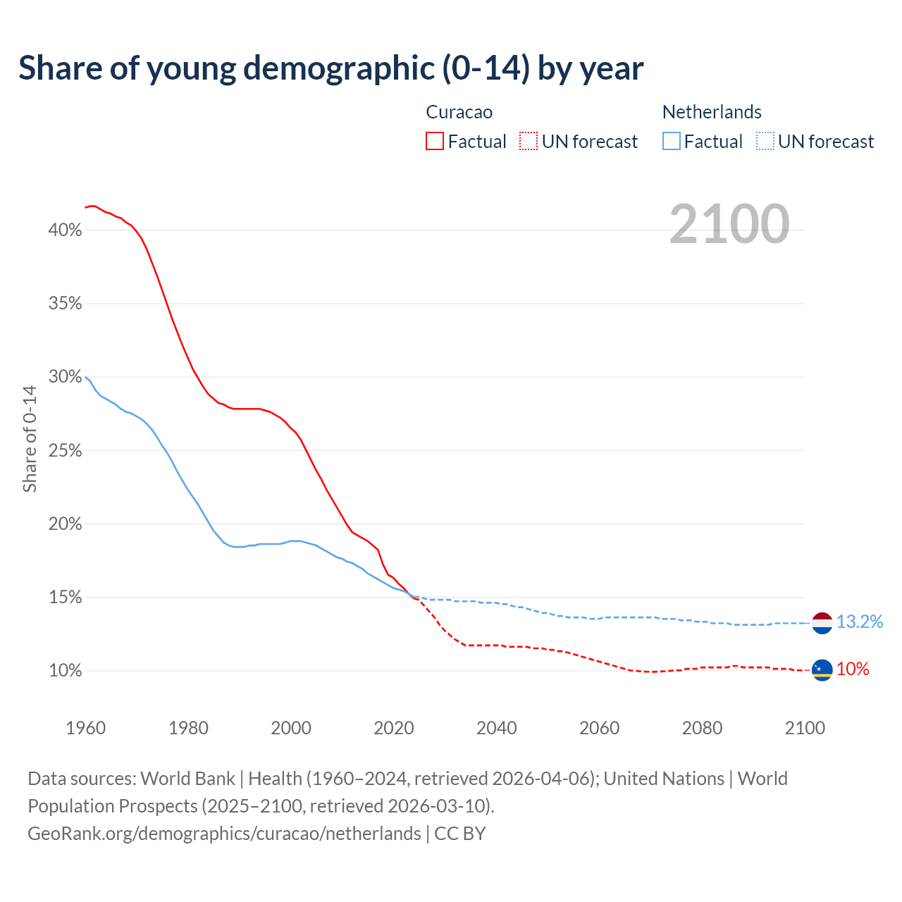 - The share of young demographic (0-15 years old) in Curacao is 14.9% vs 15% in the Netherlands.