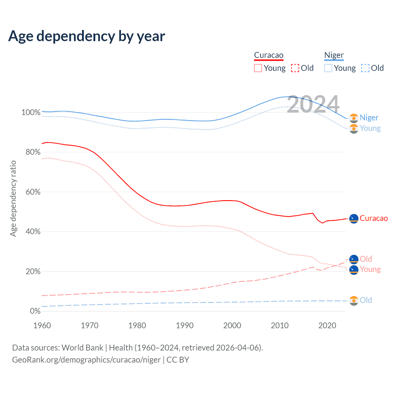 - The share of old-age demographic (65+) in Curacao is 16.8% vs 2.59% in Niger.