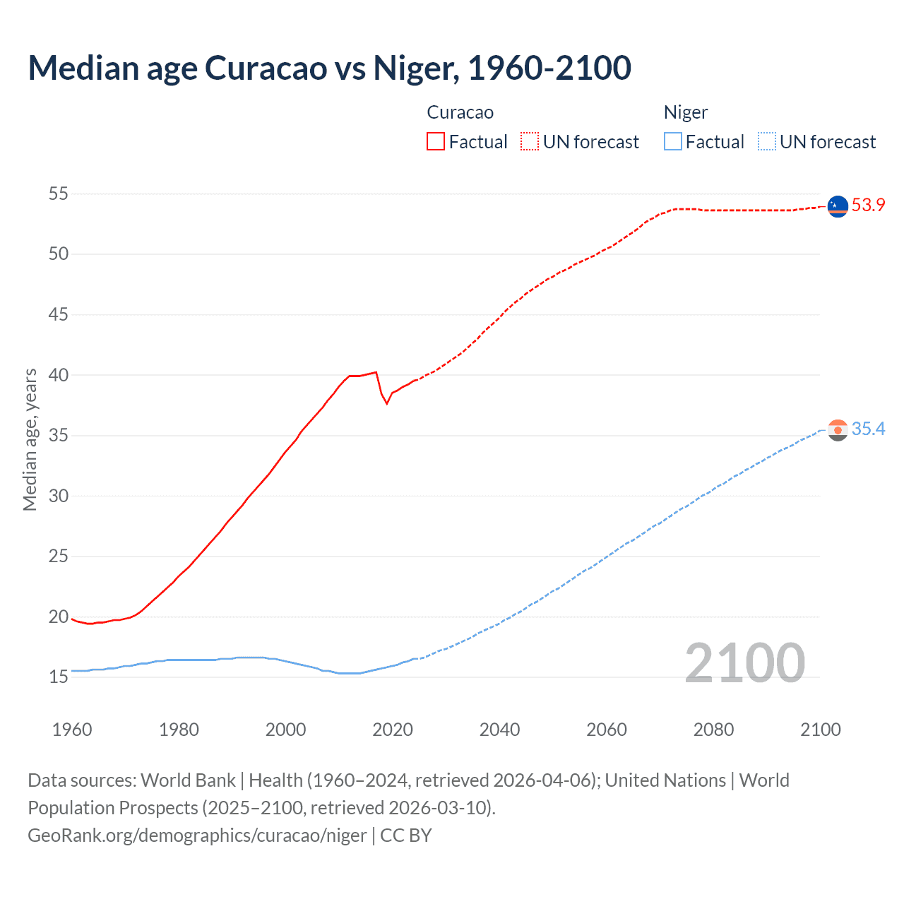 - The median age in Curacao is 39.5 years compared to 16.5 years in Niger.