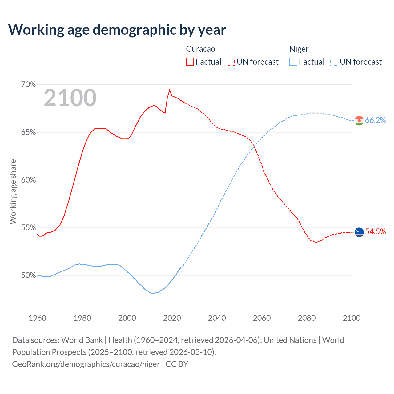 - Curacao has 107K working age adults (aged 15-64) vs 14.8M in Niger.