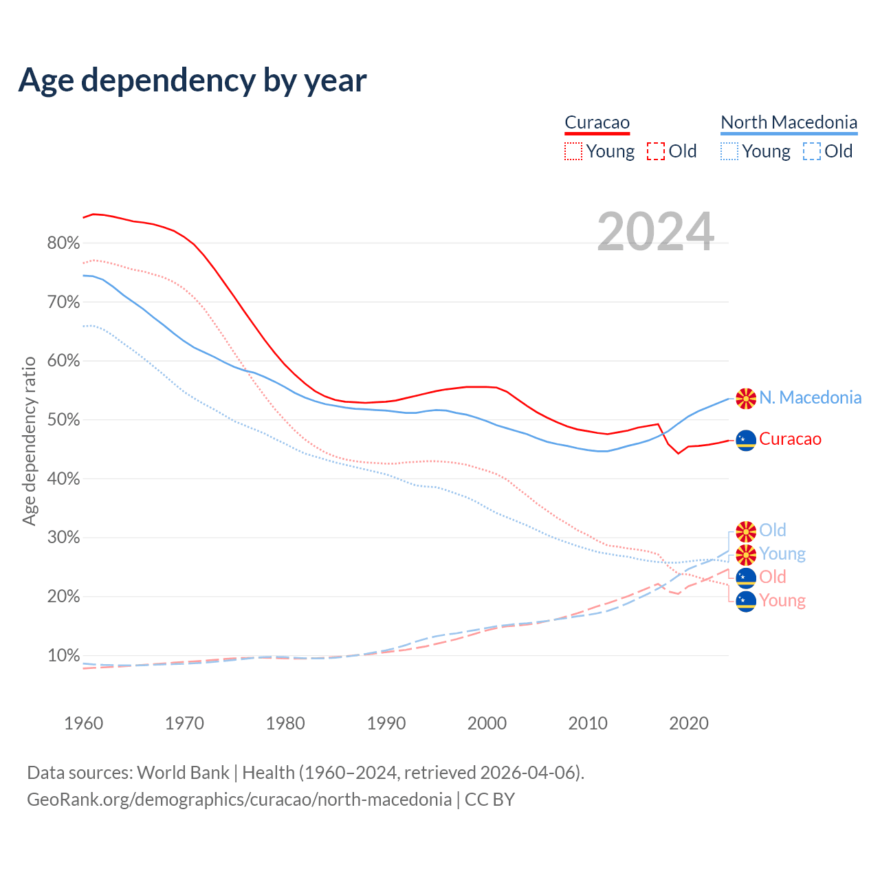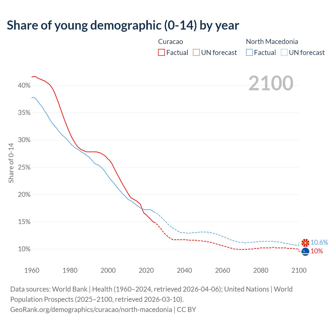 - The share of young demographic (0-15 years old) in Curacao is 14.9% vs 16.8% in North Macedonia.