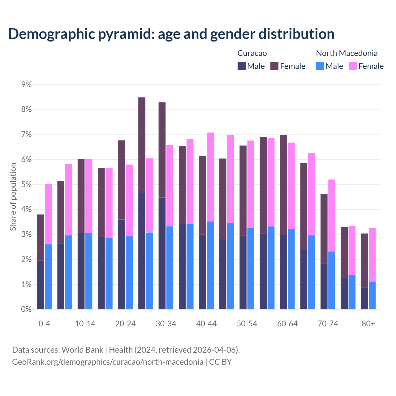 - Curacao is ranked 49/196 by median age (oldest to youngest) vs 37/196 for North Macedonia.