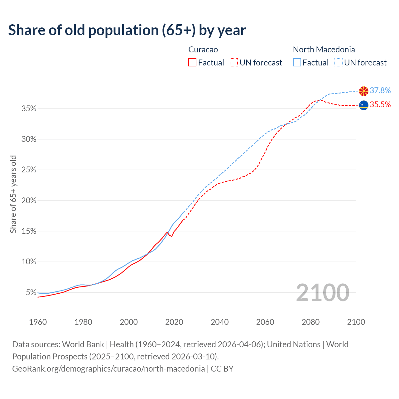 The share of older people aged 65 and over is 16.8% in Curacao and 18% in North Macedonia. Life expectancy in Curacao compared to North Macedonia .