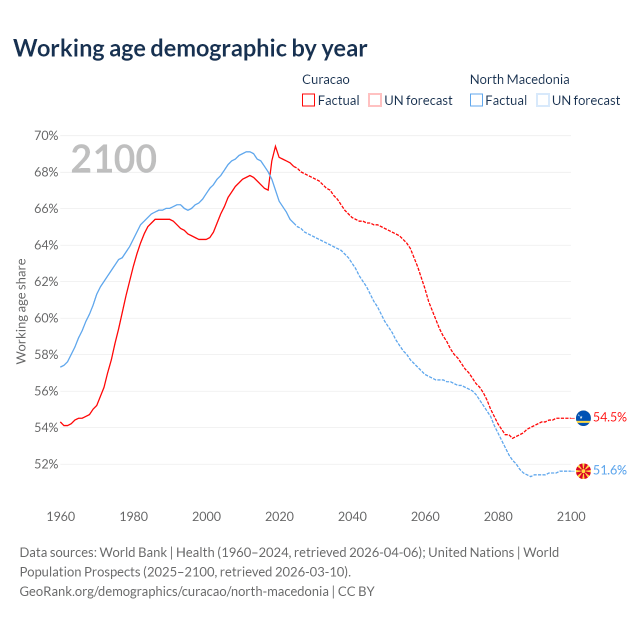- Curacao has 107K working age adults (aged 15-64) vs 1.18M in North Macedonia.